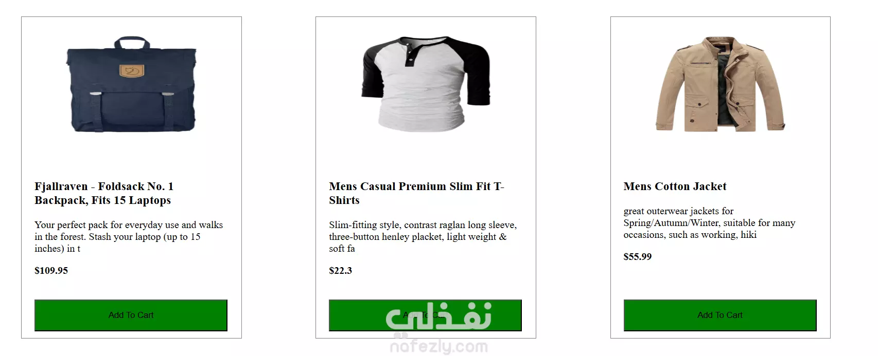عرض المنتجات على شكل بطاقات تفاعلية مع صورة، وصف مختصر، والسعر.