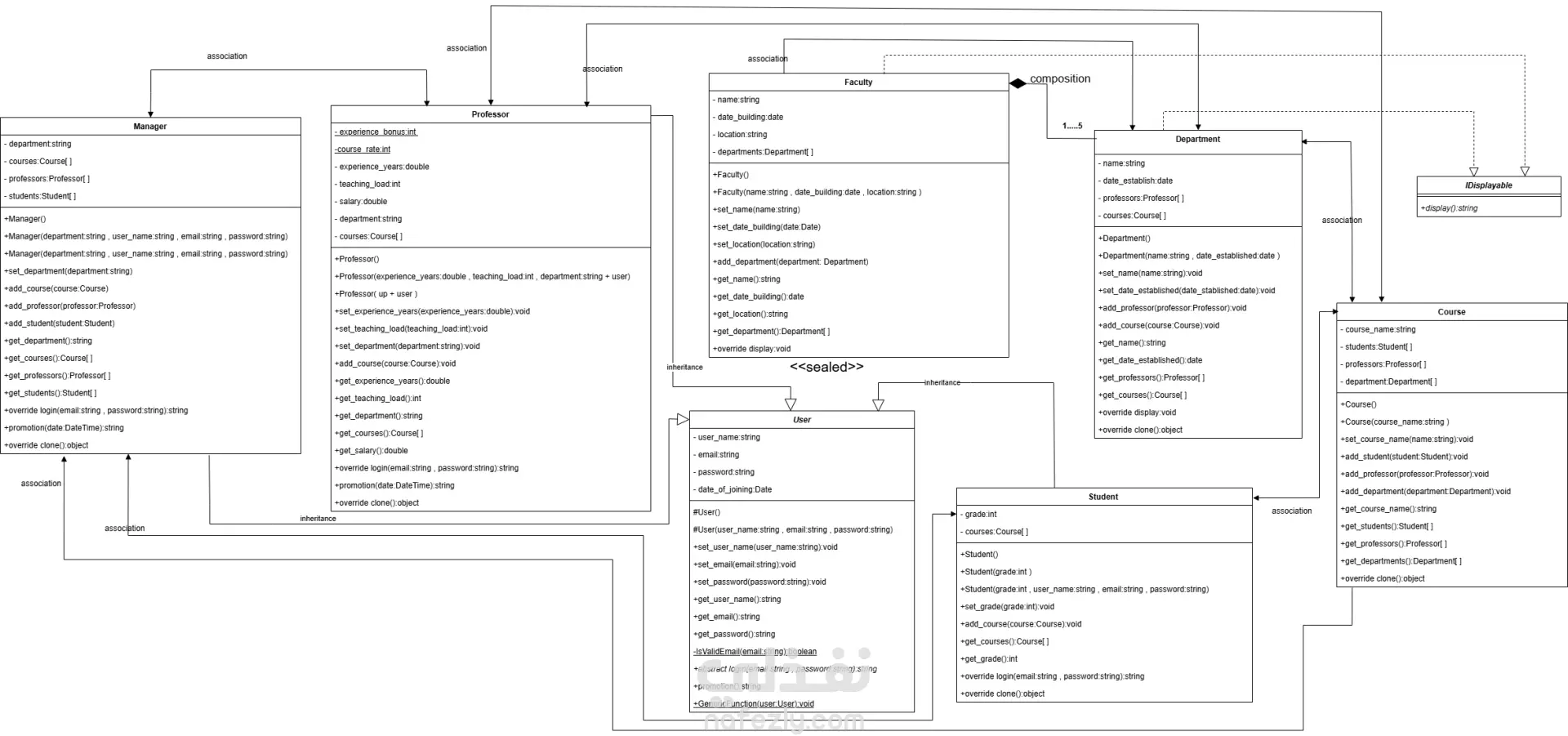 -الطلاب (Student): يحتفظ الطالب بالمقررات المسجلة، الدرجات، ودوال تسجيل الدخول.