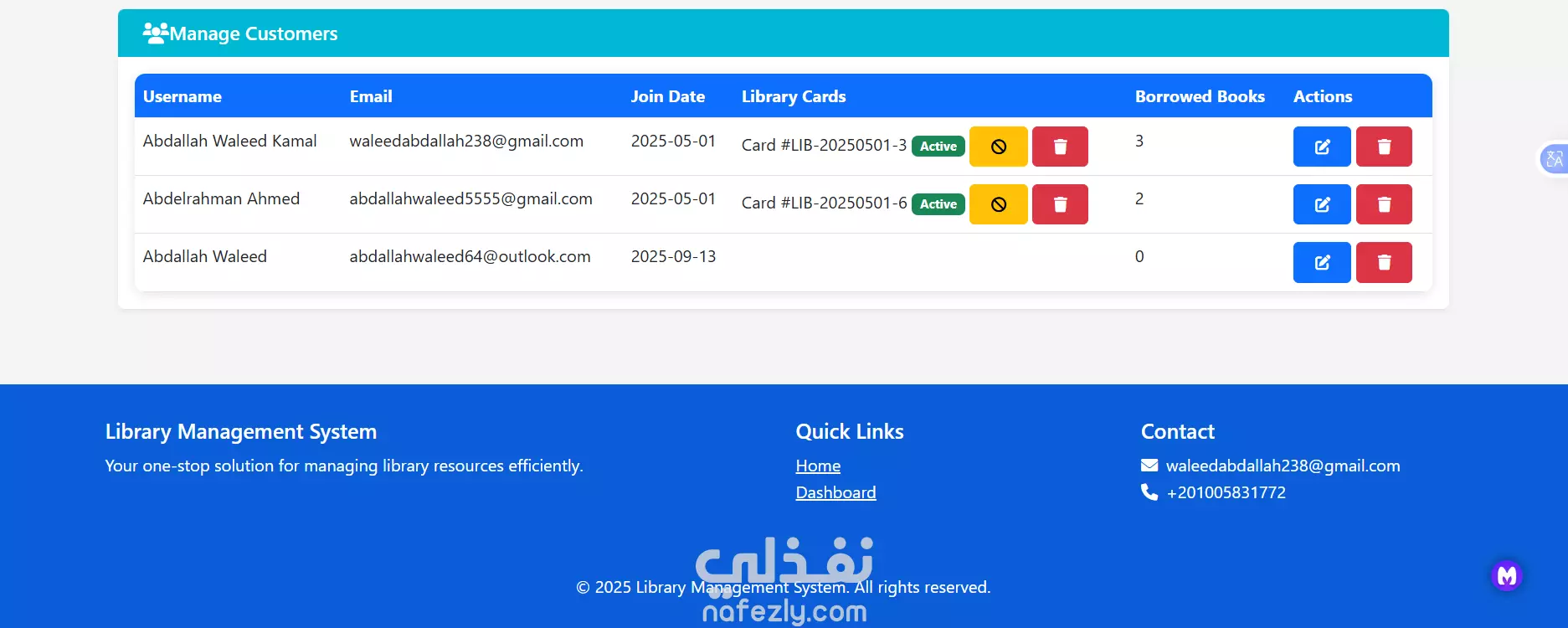 هو حل برمجي شامل لإدارة المكتبات، تم تطويره باستخدام Python وإطار العمل Flask. يهدف النظام إلى أتمتة العمليات المكتبية وتقديم تجربة استخدام عصرية. أبرز المميزات والتقنيات: إدارة شاملة: يدير النظام المستخدمين بصلاحيات متعددة ومحددة (مسؤول، أمين مكتبة، عميل)، ويوفر لوحة تحكم متقدمة لإدارة الكتب والمخزون والتصنيفات، مع دعم كامل لتشغيل فروع متعددة من منصة مركزية واحدة. ميزات عصرية: يقدم النظام ميزات حديثة مثل بطاقات المكتبة الرقمية التي تعمل برمز QR لتسريع عمليات الاستعارة والإرجاع، بالإضافة إلى وحدة متكاملة لبيع الكتب ونظام إشعارات فوري لتنبيه المستخدمين بالمواعيد الهامة. بنية تقنية قوية: يعتمد على هيكلية RESTful API التي تفصل بين الواجهة والخادم، مما يسهل عملية التطوير والتكامل مع أنظمة أخرى. يستخدم SQLAlchemy للتعامل الآمن والفعال مع قواعد البيانات. أمان وتجربة استخدام: يضمن حماية البيانات عبر نظام مصادقة آمن وصلاحيات وصول محددة لكل دور. كل ذلك مُقدَّم عبر واجهة مستخدم حديثة (UI/UX)، سهلة الاستخدام ومتجاوبة مع جميع الشاشات.