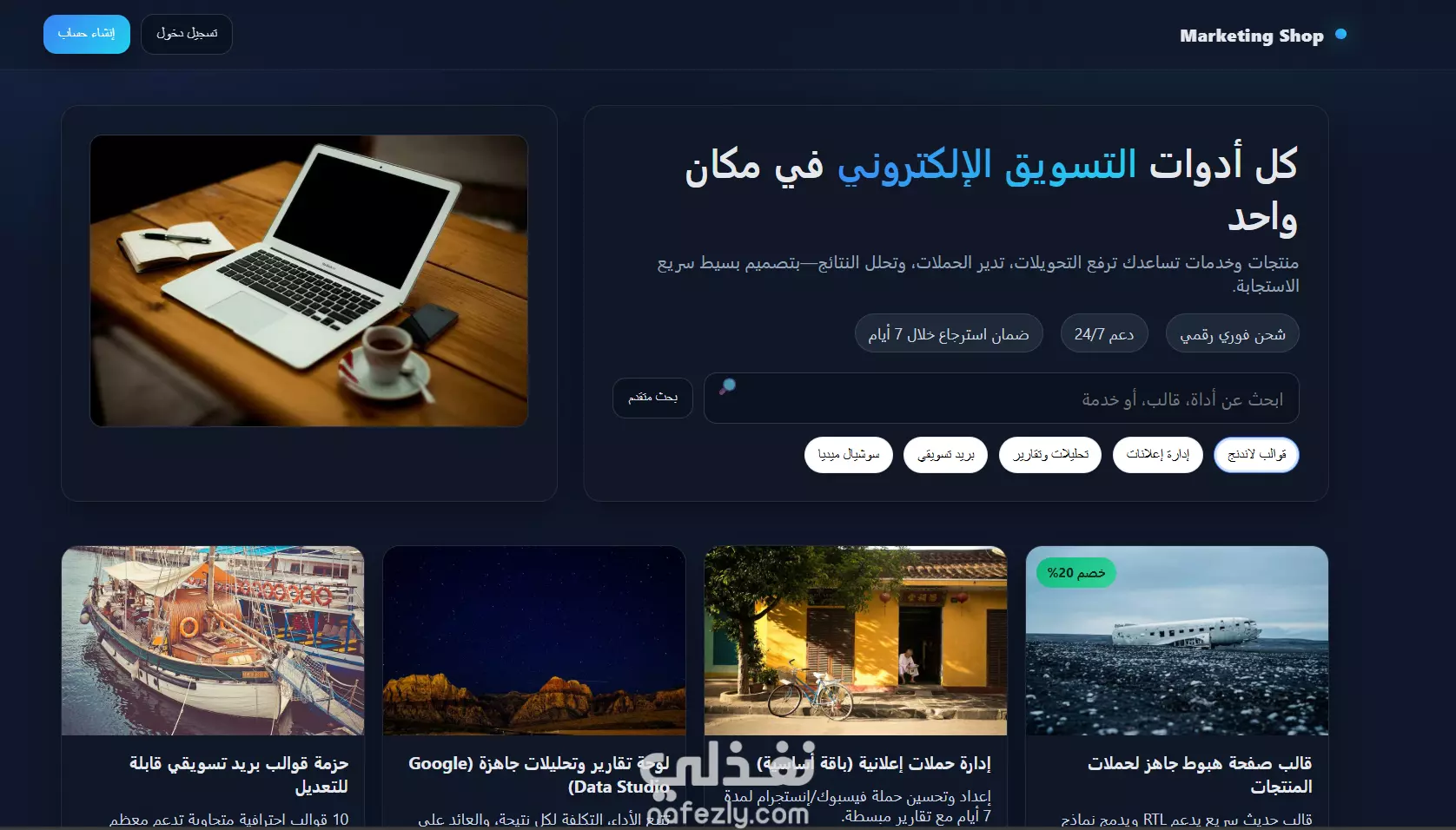 مشروع متجر إلكتروني تجريبي متخصص في التسويق الإلكتروني، تم تصميمه باستخدام HTML و CSS فقط، بدون أي مكتبات أو جافاسكريبت. يحتوي الموقع على: هيدر تفاعلي مع شعار وأزرار تسجيل الدخول وإنشاء الحساب. قسم رئيسي (Hero Section) به عنوان جذاب، مميزات (شحن فوري، دعم 24/7، ضمان)، مربع بحث، وفلاتر للتصنيفات. شبكة منتجات (Product Grid) تعرض 12 بطاقة منتج/خدمة، تشمل: صورة المنتج + شارة خصم/جديد. عنوان ووصف قصير لكل منتج. السعر الحالي + السعر القديم (إن وجد). تقييم بالنجوم وعدد المراجعات. أزرار إضافة للسلة أو للمفضلة. تصميم متجاوب بالكامل يعمل على الموبايل والتابلت والكمبيوتر. فوتر بسيط يحتوي على روابط للسياسة والشروط.