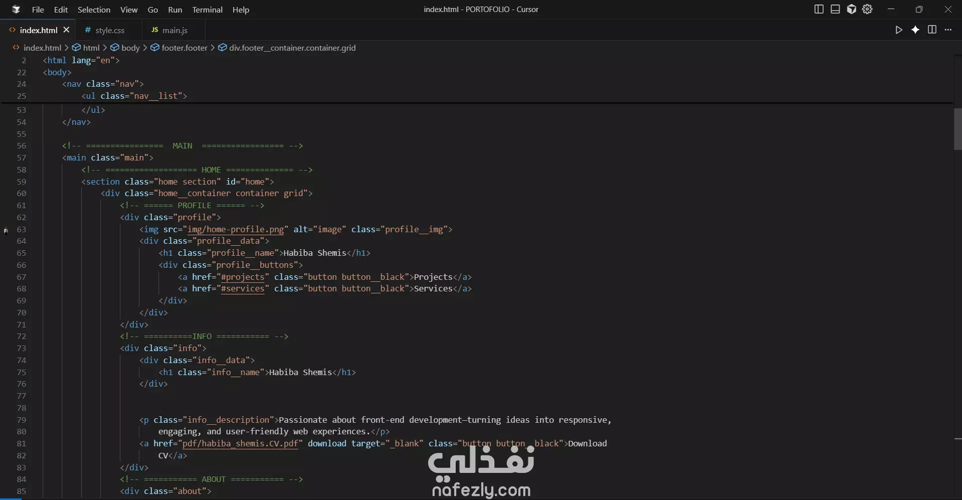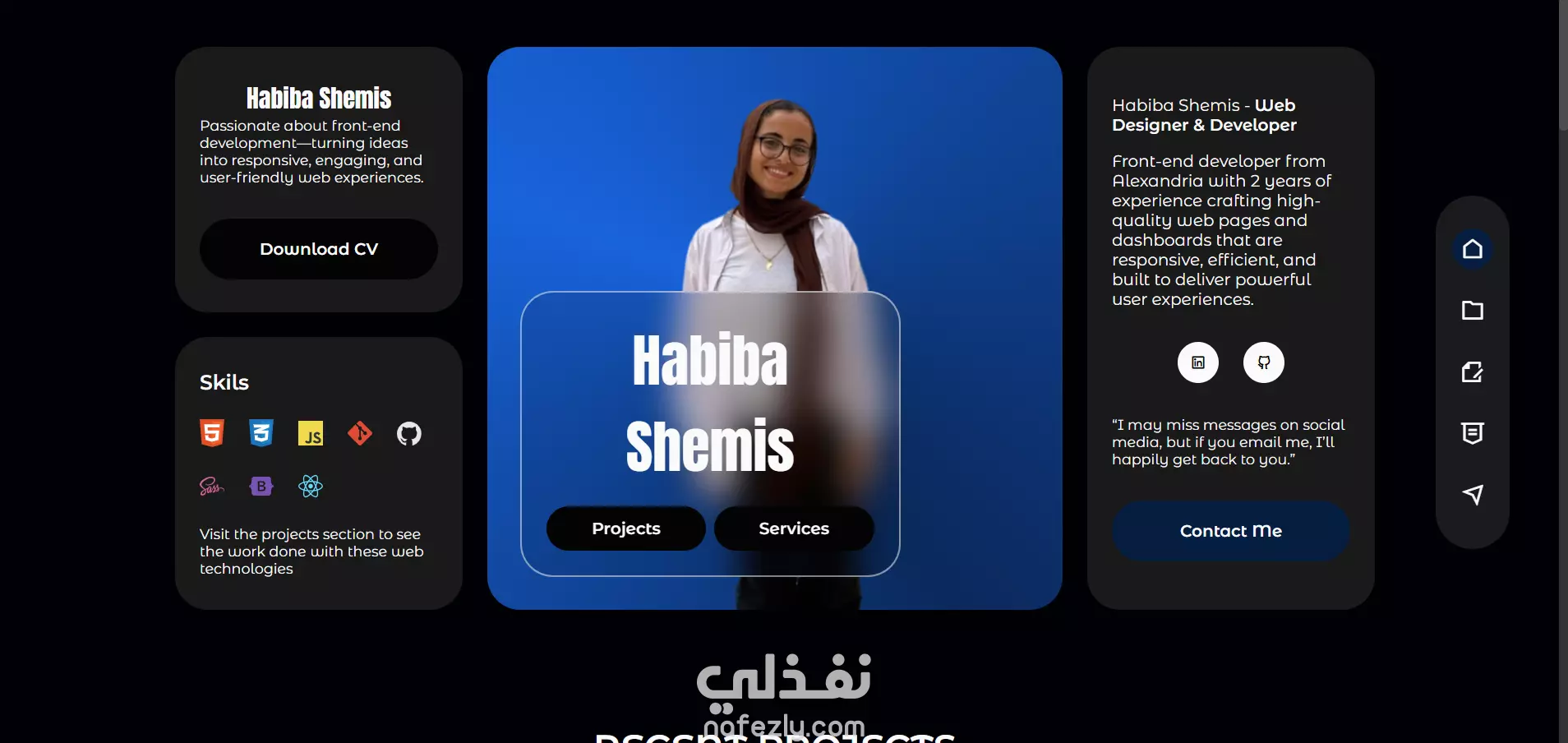 "موقع شخصي متجاوب بيعرض السيرة الذاتية والأعمال السابقة بشكل منظم واحترافي، وبيشتغل بكفاءة على مختلف الأجهزة (كمبيوتر، تابلت، موبايل). الموقع معمول باستخدام HTML, CSS, JavaScript مع التركيز على تجربة مستخدم سلسة وتصميم حديث بيبرز المهارات والخبرات بشكل واضح."