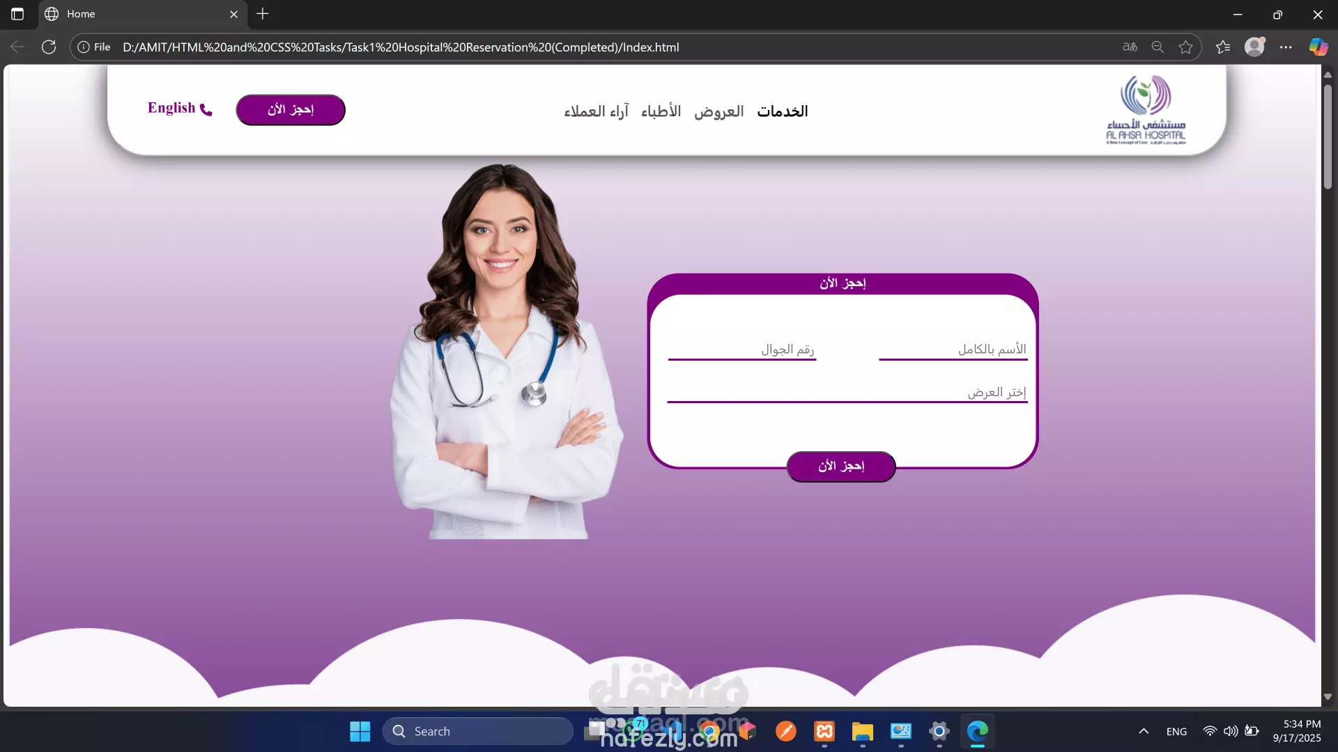 مشروع عبارة عن واجهة مستخدم لمستشفى باستخدام HTML و CSS فقط، يتضمن:
