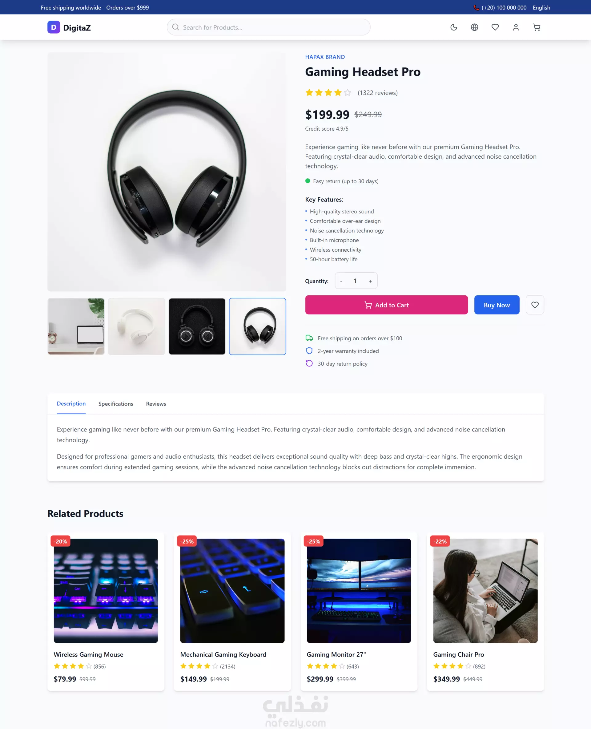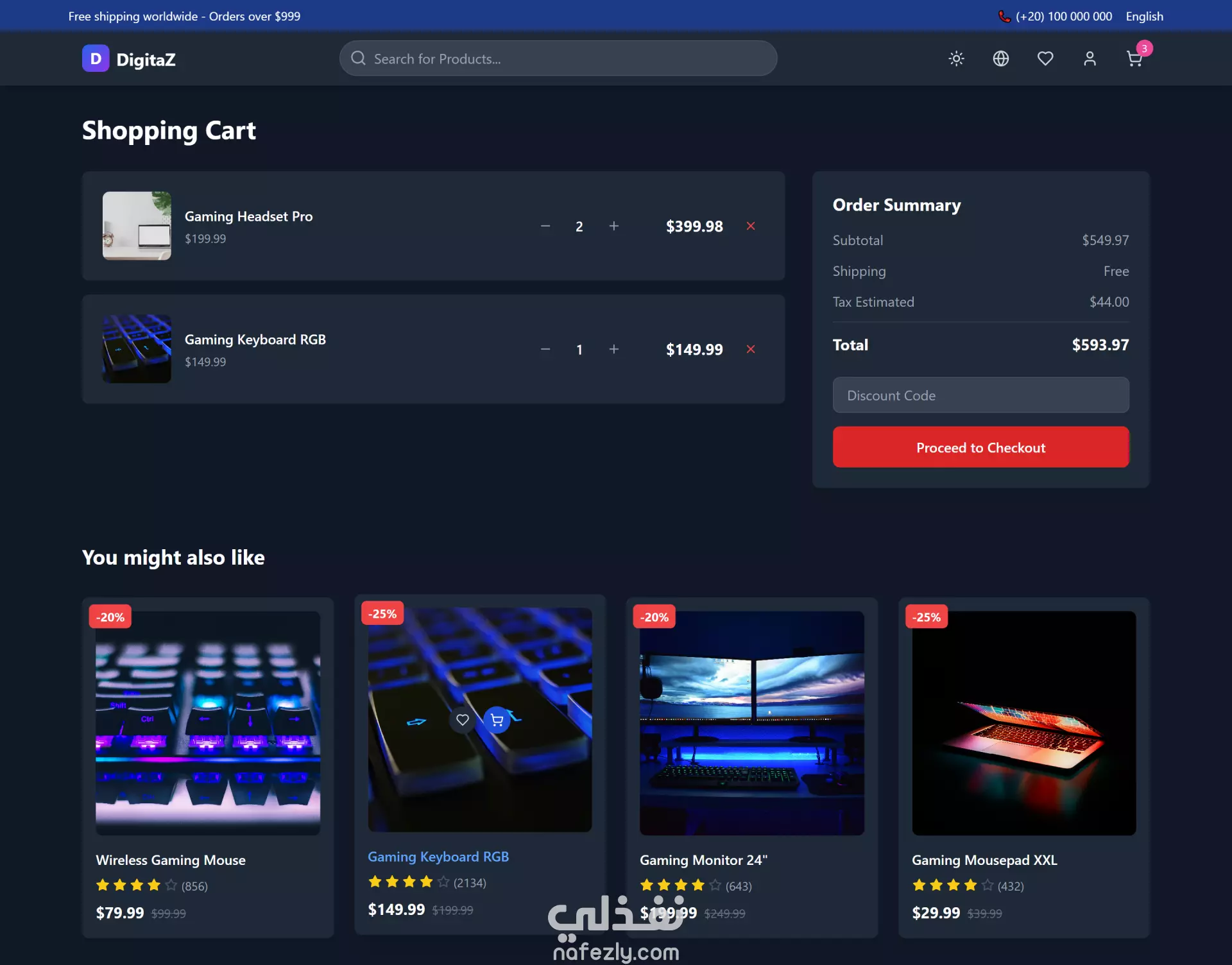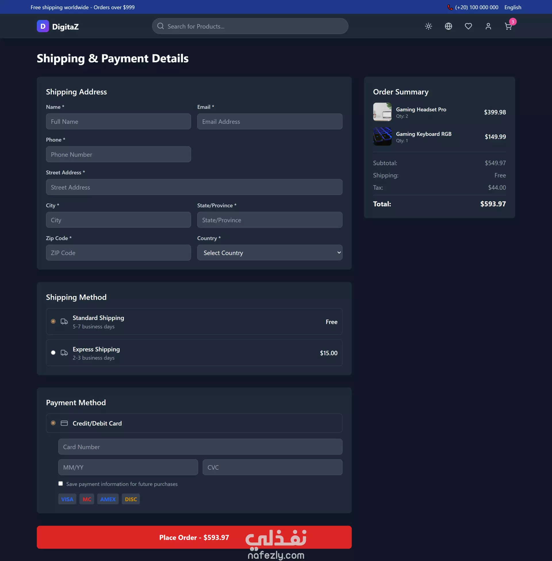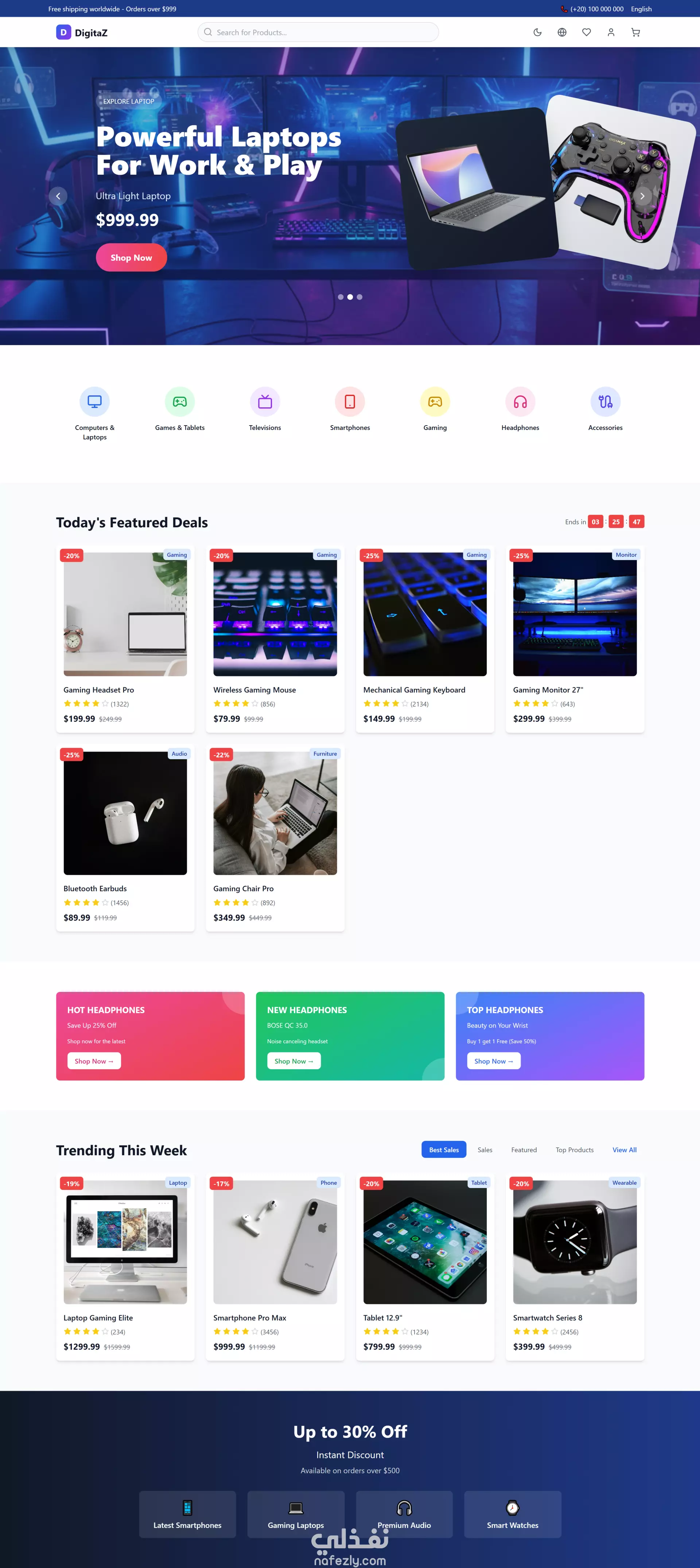 متجر إلكتروني متكامل وعصري مصمم خصيصًا لعشاق التكنولوجيا والألعاب، يقدم تجربة تسوق سلسة وغنية بالميزات. يهدف المشروع إلى توفير منصة سهلة الاستخدام لعرض وبيع مجموعة واسعة من المنتجات الإلكترونية وأدوات الجيمرز، مع التركيز على الأداء العالي والتصميم الجذاب والتجاوب مع مختلف الأجهزة. - المميزات الرئيسية للموقع: 1.تصميم متجاوب (Fully Responsive Design): الموقع مصمم ليعمل بكفاءة ويتكيف بشكل مثالي مع جميع أحجام الشاشات. 2.دعم متعدد اللغات (Multi-Language Support): يتيح الموقع للمستخدمين التبديل بين لغات مختلفة، مما يوسع قاعدة المستخدمين المحتملين ويجعل تجربة التسوق أكثر سهولة وراحة للمستخدمين. 3.الوضع الليلي/النهاري (Light/Dark Theme Toggle): يوفر الموقع خيار التبديل بين الوضع الفاتح والوضع الداكن، مما يتيح للمستخدمين تخصيص واجهة المستخدم حسب تفضيلاتهم الشخصية وبيئة الإضاءة المحيطة، ويقلل إجهاد العين خاصة أثناء الاستخدام لفترات طويلة. -التقنيات المستخدمة في البناء: [React.js - TypeScript - Tailwind CSS] -الموقع يتكون من أربع صفحات أساسية توفر دورة تسوق كاملة: + صفحة الهبوط (Landing Page / Home Page): تعرض أحدث المنتجات والعروض الترويجية والمنتجات المميزة. تحتوي على أقسام لتصنيفات المنتجات الشائعة. توفر شريط بحث لسهولة العثور على المنتجات. + صفحة تفاصيل المنتج (Product Detail Page): تعرض معلومات مفصلة عن كل منتج (وصف، مواصفات، صور متعددة، تقييمات). تتيح للمستخدمين إضافة المنتج إلى سلة التسوق. تعرض اقتراحات لمنتجات ذات صلة. + صفحة سلة التسوق (Shopping Cart Page): تسمح للمستخدمين بمراجعة المنتجات المضافة إلى سلة التسوق. تتيح تعديل الكميات أو إزالة المنتجات. تعرض الإجمالي الفرعي وتكاليف الشحن والضرائب قبل الدفع. + صفحة الدفع (Checkout Page): توجه المستخدمين لإدخال معلومات الشحن والدفع.