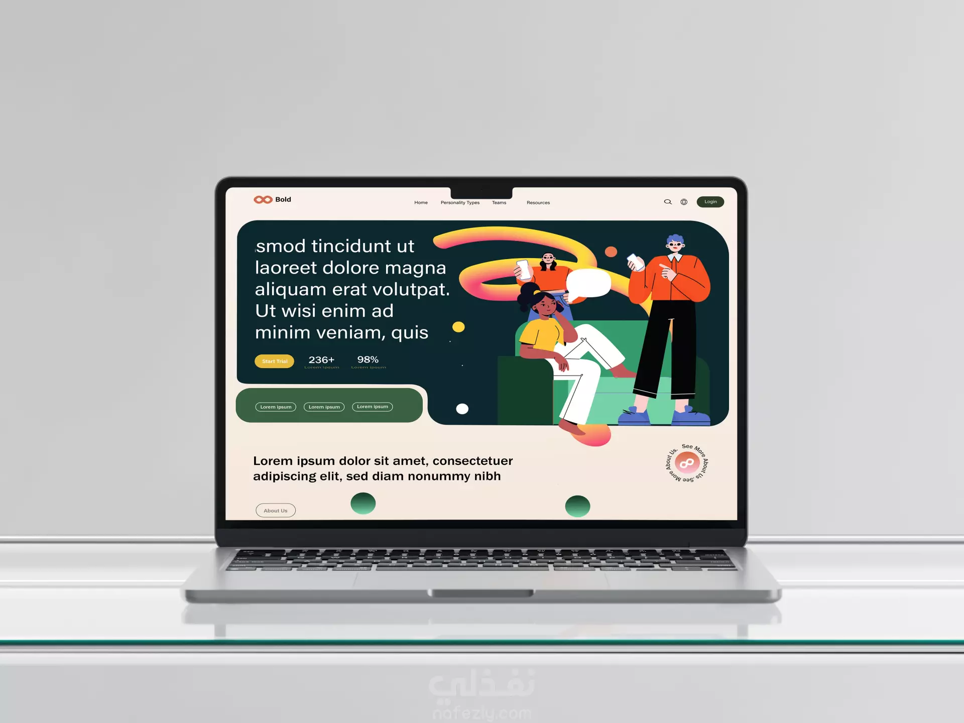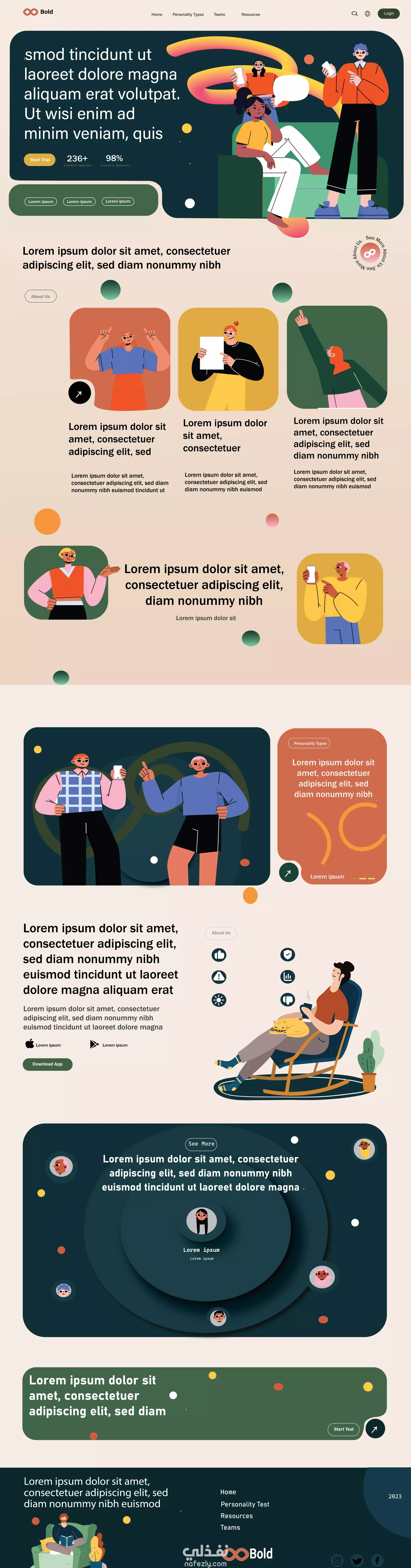 This website design for Bold was created using Adobe Illustrator, based on a reference design. I customized it with a vibrant color palette of deep greens, oranges, and neutrals, along with playful illustrations and clean typography. The goal was to keep the design modern, user-friendly, and responsive while adding my own creative touch. هذا التصميم لموقع Bold تم تنفيذه باستخدام Adobe Illustrator، بالاعتماد على مرجع بصري. أضفت لمساتي الخاصة من خلال استخدام لوحة ألوان حيوية (الأخضر الداكن، البرتقالي، والألوان الحيادية) مع رسومات مبهجة وخطوط بسيطة. الهدف كان تقديم تصميم عصري، سهل الاستخدام، ومتجاوب يعكس الطابع الإبداعي