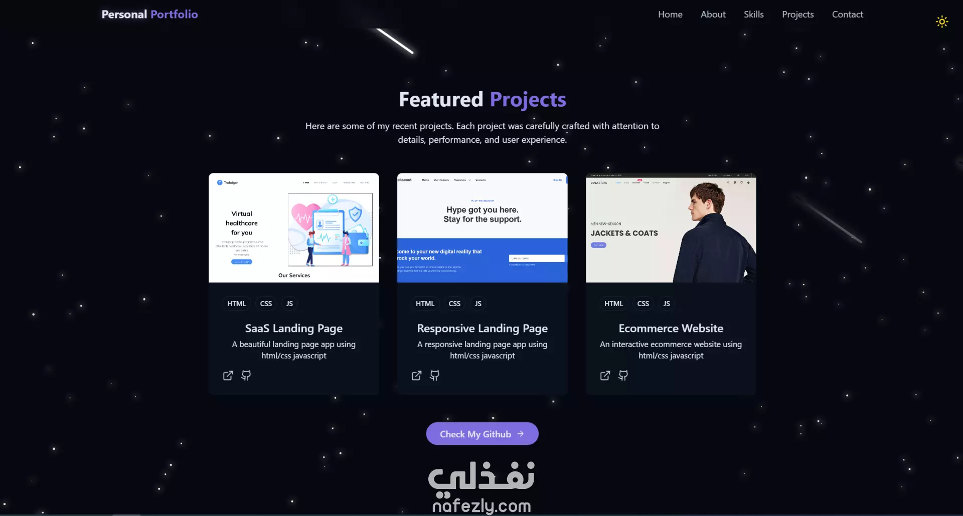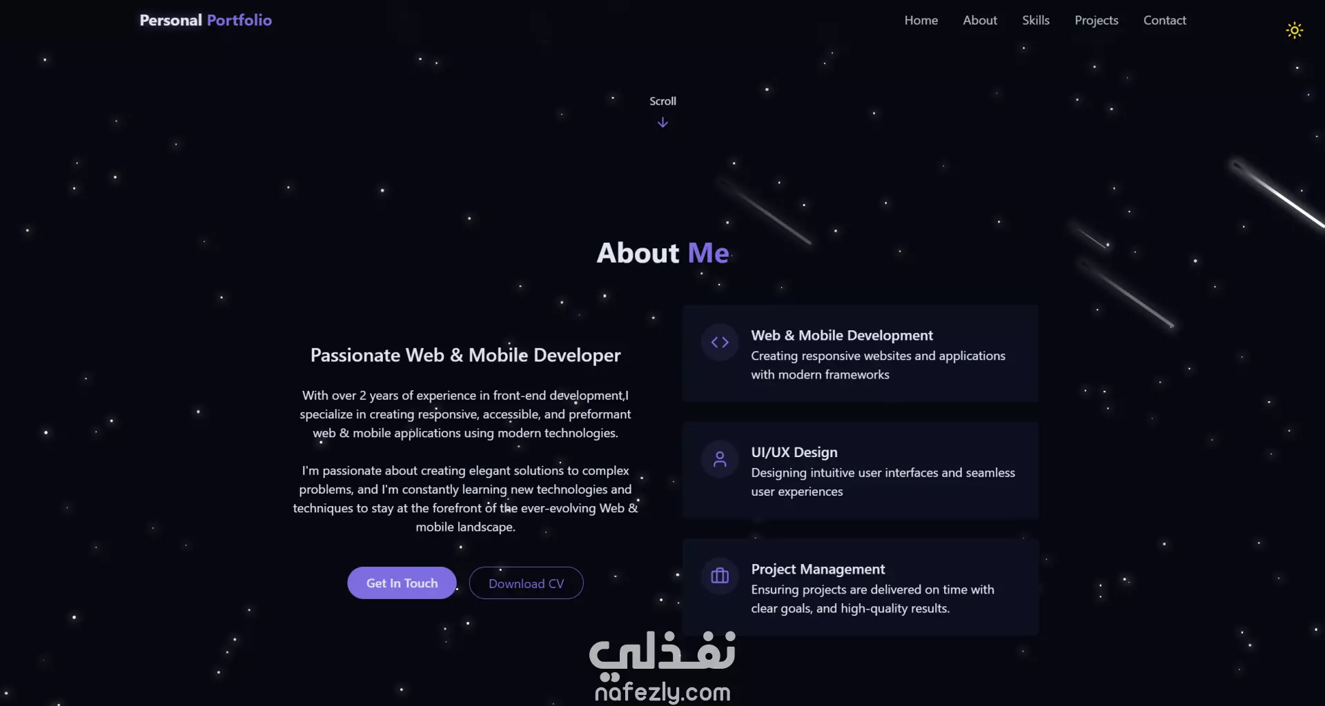 تنقل سهل وتجربة مستخدم راقية: واجهات صفحات مثل "الرئيسية"، "عني"، "مشاريعي"، و"تواصل معي" تتصل بسلاسة، مع تحسينات بصريّة تُشجع الزوار على التفاعل.
