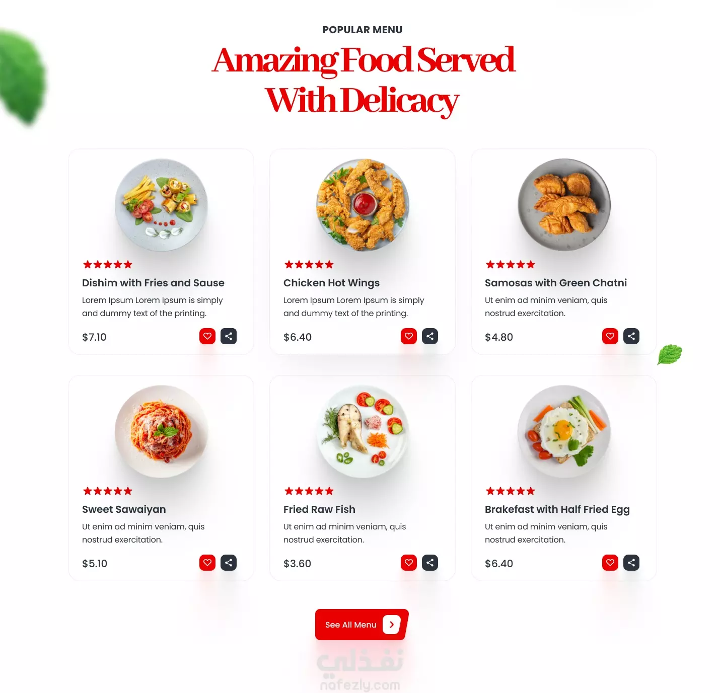 عبارة عن صفحة هبوط لمطعم وبها بعض المميزات مثل المؤثرات المرئية و التجاوب مع الأجهزة المختلفة وبها عدة أقسام