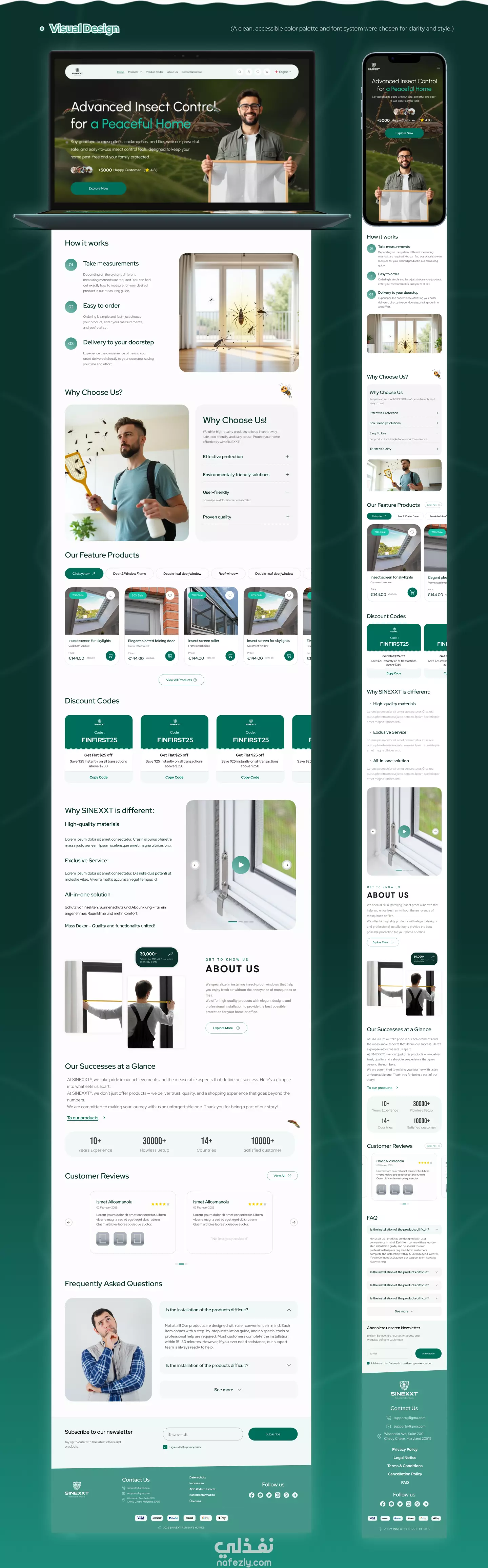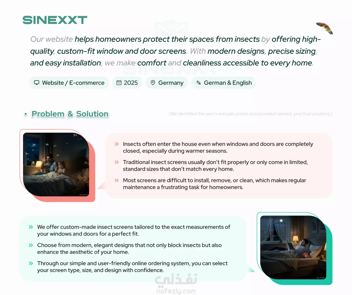 "موقع إلكتروني لشركة ألمانية تُدعى Sinexxt، متخصصة في تركيب الشبابيك والأبواب المزودة بأنظمة حماية من الحشرات."