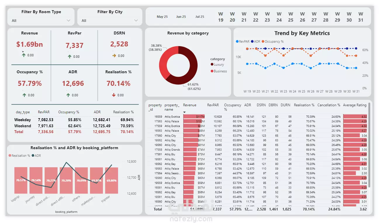 عملتُ مؤخرًا على بناء لوحة معلومات ديناميكية باستخدام Power BI لتتبع مقاييس أداء الفنادق الرئيسية عبر أبعاد متعددة. تُركز لوحة المعلومات على مؤشرات الأداء الرئيسية، مثل الإيرادات، ومتوسط سعر الغرفة اليومي، ونسبة الإشغال، ونسبة الإنجاز، وتتيح التصفية حسب نوع الغرفة، والمدينة، ومنصة الحجز، والفترات الأسبوعية.