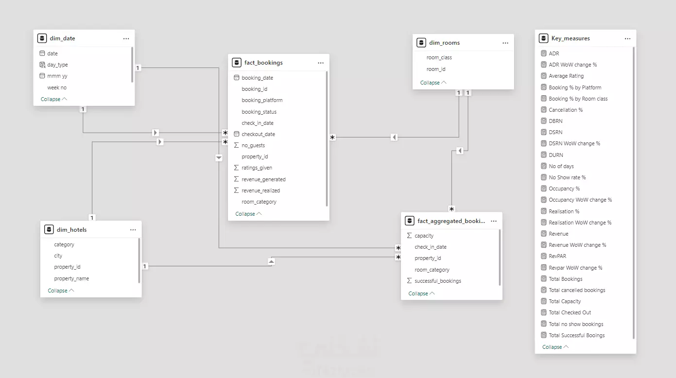 باستخدام DAX، أنشأتُ مقاييس محسوبة تستجيب لمرشحات آنية، مما يُساعد صانعي القرار على تحديد الاتجاهات، ومقارنة القطاعات، وتقييم أداء الحجز على مدار الوقت والفنادق.