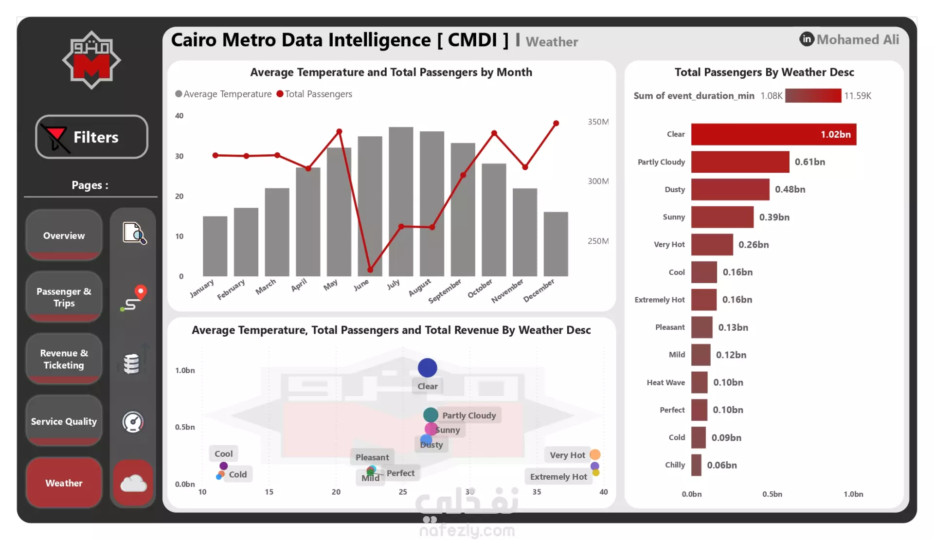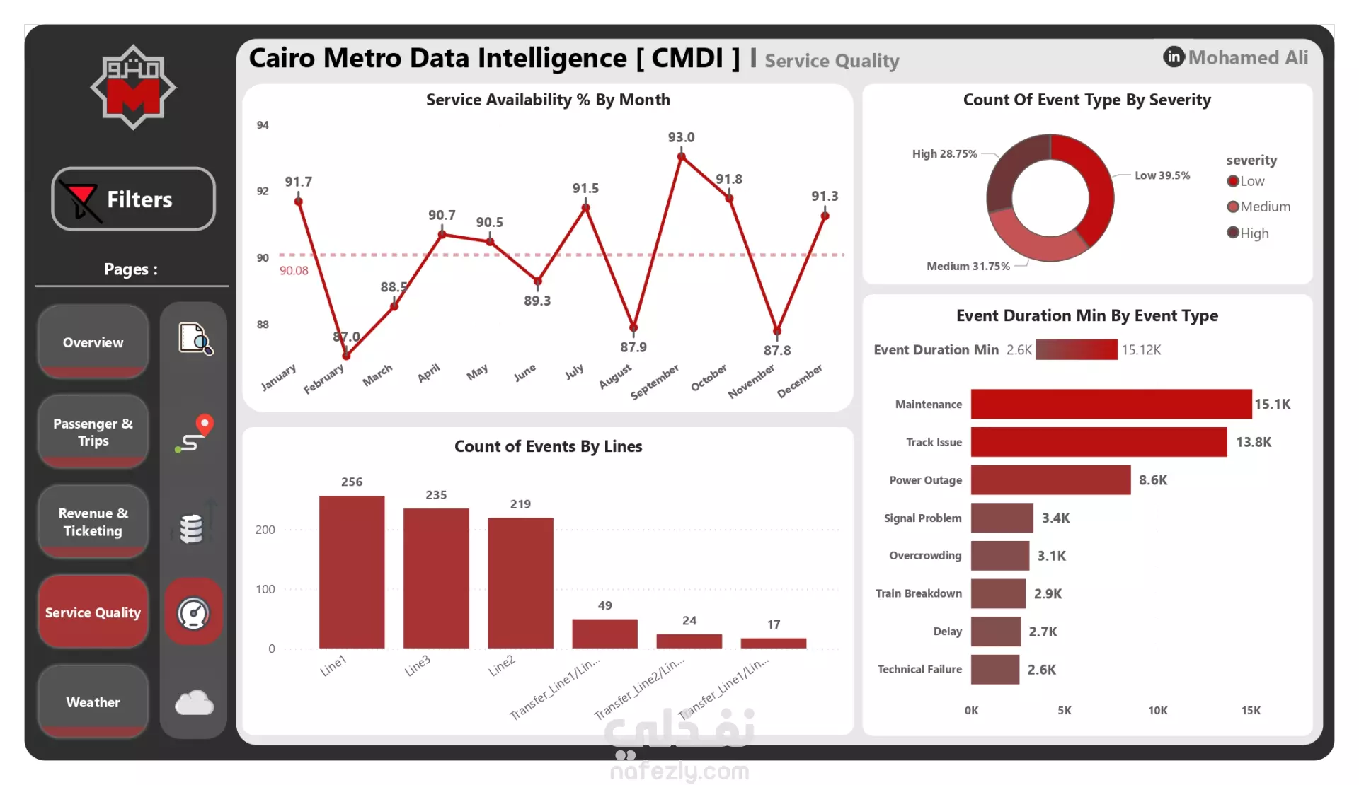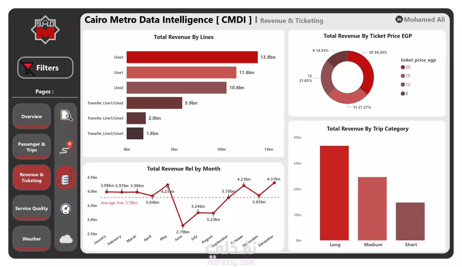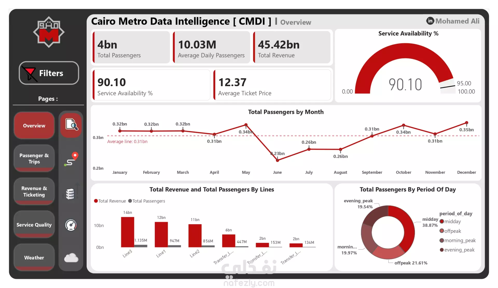 محلل بيانات متخصص في ذكاء الأعمال وتحويل البيانات إلى قرارات عملية. نفذت مشروع متكامل عن مترو القاهرة باعتباره أهم وسيلة نقل عامة يعتمد عليها ملايين المصريين يوميًا.