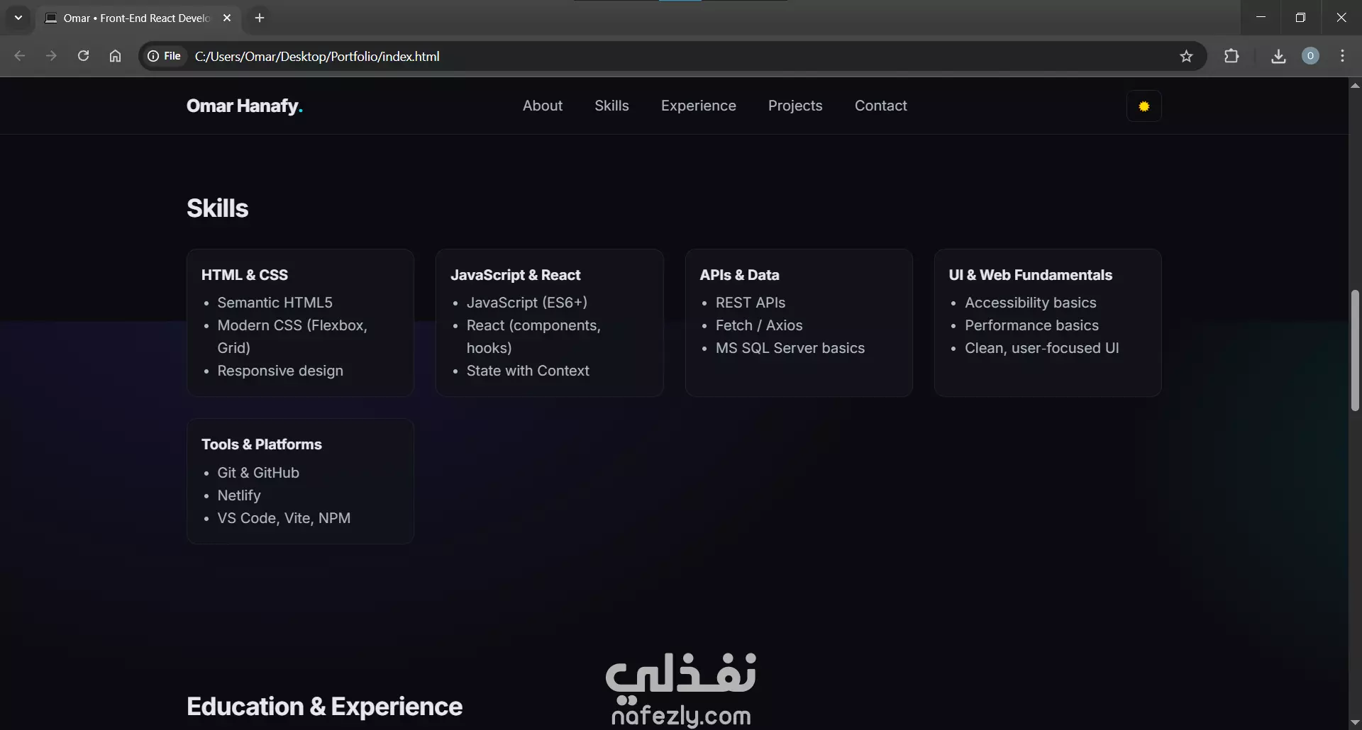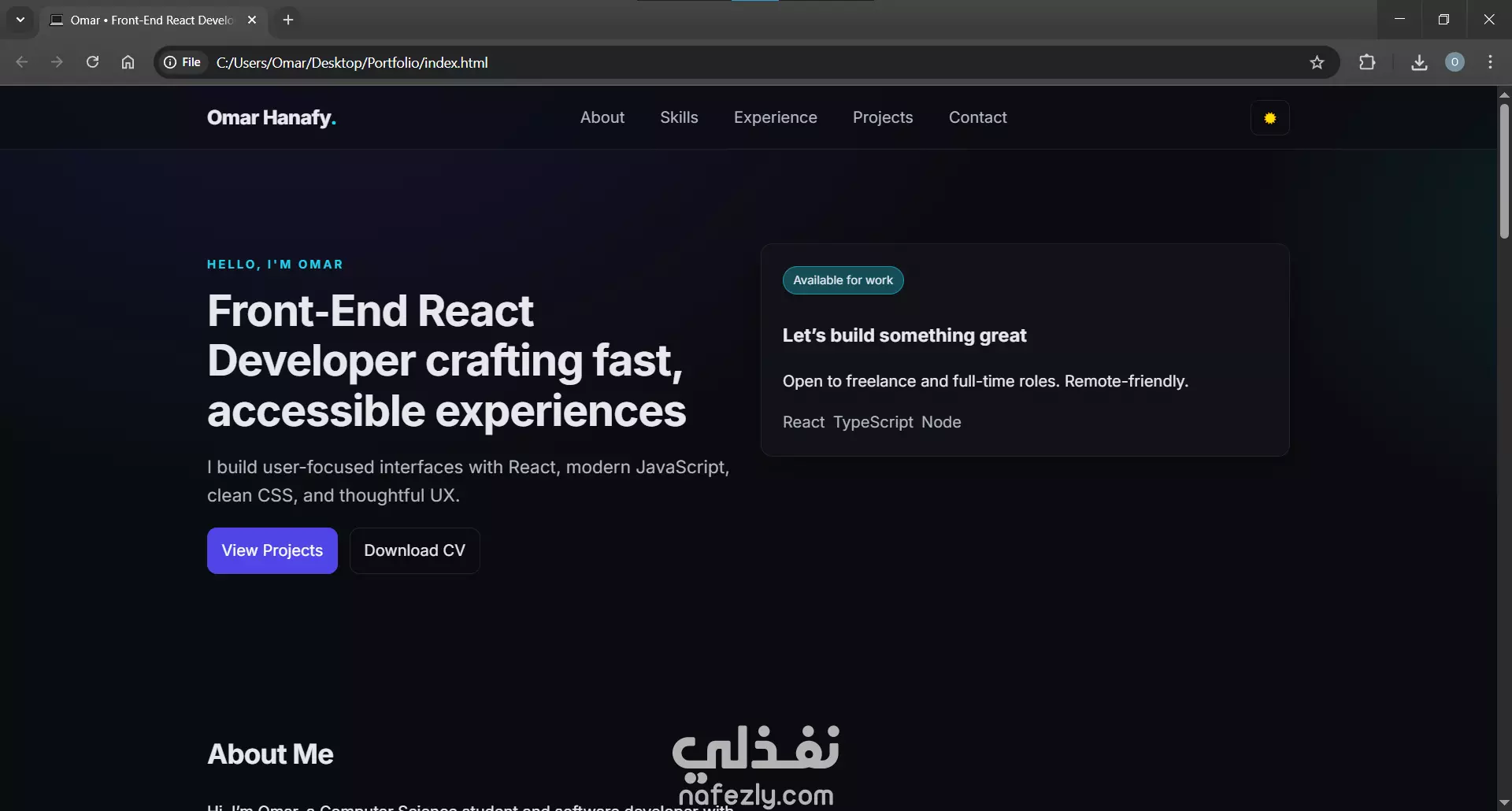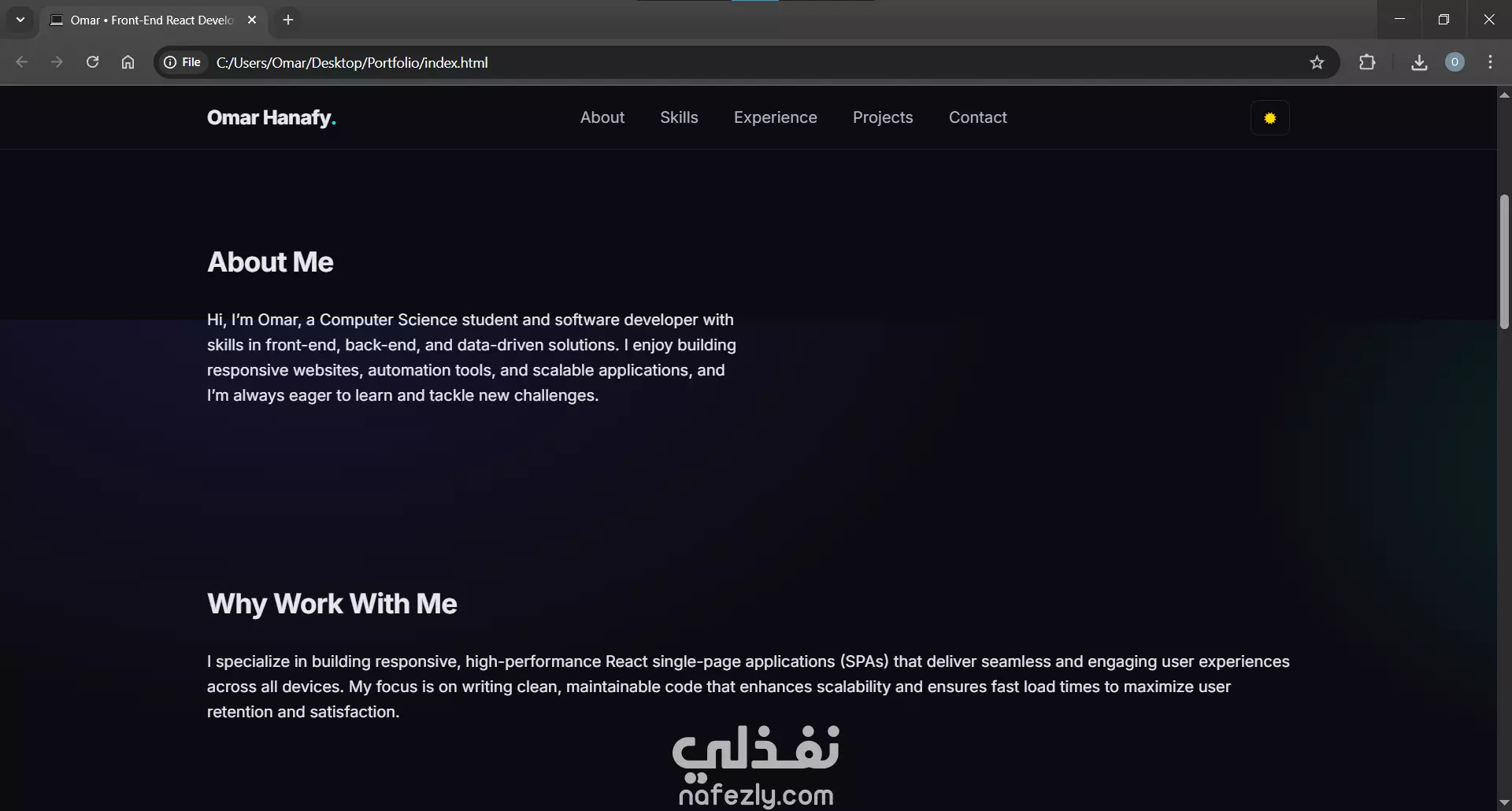 صفحة تعريفية إلكترونية مرتبة ومصممة بشكل جميل، تعرض معلوماتك وخبراتك وباقي أعمالك السابقة بطريقة سهلة وواضحة.