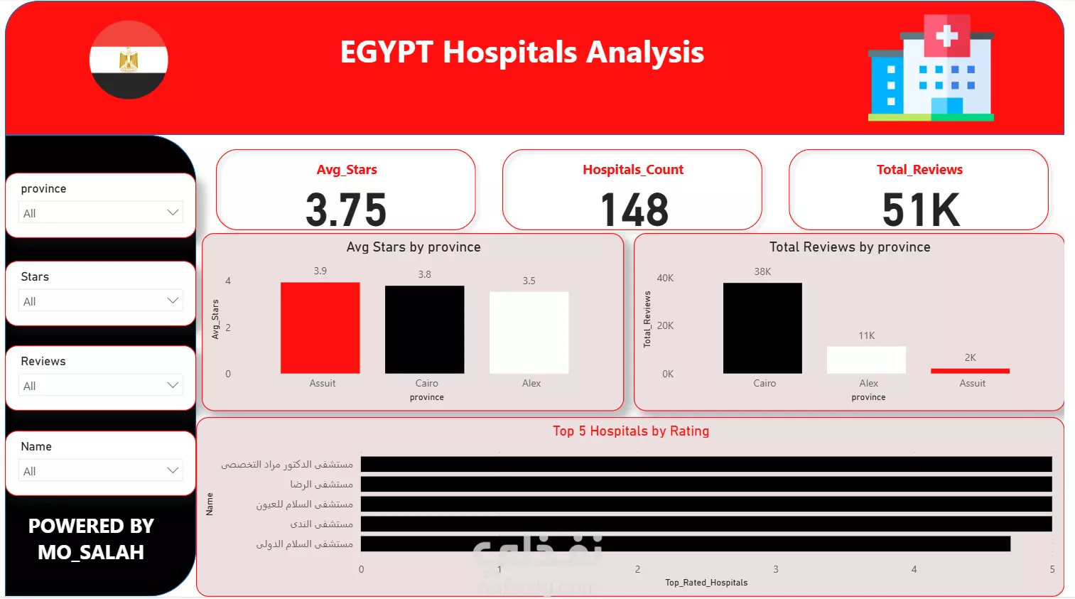 قمت بجمع بيانات من خرائط جوجل عن 150 مستشفى موزعة على ثلاث محافظات في مصر (القاهرة – الإسكندرية – أسيوط). البيانات تضمنت اسم المستشفى، التقييم بالنجوم، عدد المراجعات، العنوان، والموقع الإلكتروني باستخدام لغه بايثون ومكتبة selenium المتخصصه في التعامل مع المواقع الديناميكية. بعد ذلك قمت بتنظيف البيانات باستخدام Power Query وتجهيزها للعرض. ثم صممت لوحة تحكم تفاعلية على Power BI تعرض: متوسط التقييمات الكلي ولكل محافظة. إجمالي عدد المراجعات. توزيع المستشفيات حسب عدد النجوم. مقارنة المحافظات من حيث الجودة والشعبية. ترتيب لأعلى المستشفيات تقييماً وأعلى المستشفيات من حيث عدد المراجعات. رسم يوضح العلاقة بين عدد المراجعات ومتوسط التقييمات. الداشبورد يعطي صورة واضحة عن جودة وشهرة المستشفيات في المحافظات الثلاث ويساعد على استخراج مؤشرات أساسية مثل أي محافظة تضم أفضل مستشفيات من حيث التقييم أو الأكثر تفاعلاً من حيث المراجعات.