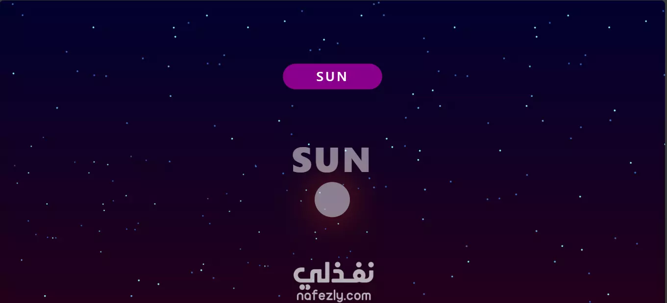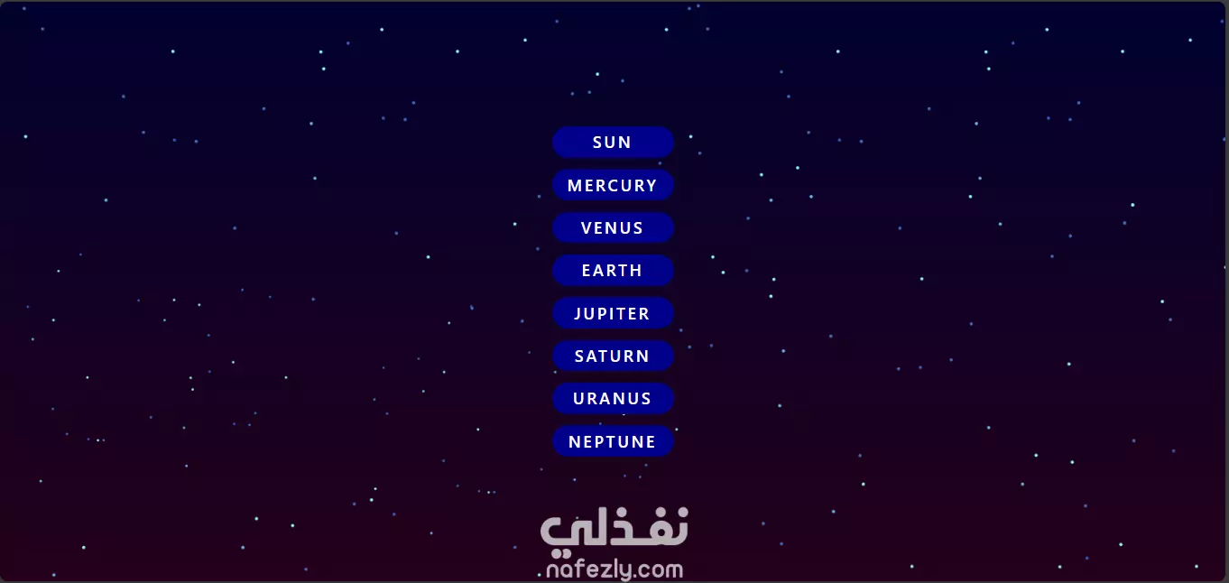 قائمة تفاعلية تضم (Sun, Mercury, Venus, Earth, Jupiter, Saturn, Uranus, Neptune).