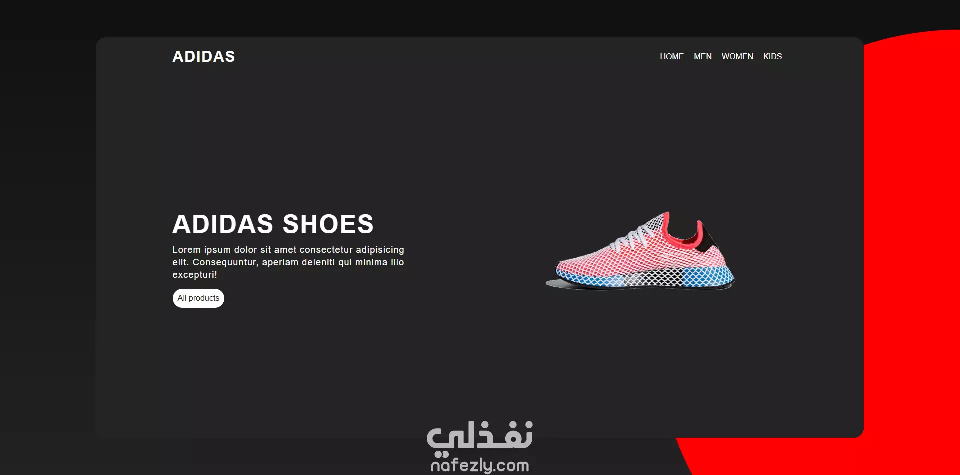 المشروع يتمثل في تصميم صفحة هبوط (Landing Page) حديثة ومرنة مخصصة لعرض منتجات Adidas Shoes. الصفحة تأتي بخلفية داكنة مع لمسات لونية مميزة بالأسود والأحمر، ما يمنحها طابعًا احترافيًا وجذابًا. 1. المكونات الرئيسية للصفحة: الهيدر (Header): يتضمن شعار Adidas في الجهة اليسرى، بينما تظهر قائمة التنقل (Navigation Bar) في الجهة اليمنى وتشمل أقسام الموقع: (Home – Men – Women – Kids). 2. الجزء الرئيسي (Hero Section): صورة بارزة لحذاء Adidas في الجهة اليمنى. عنوان رئيسي واضح وكبير ADIDAS SHOES مع نص وصفي قصير. زر تفاعلي (Call To Action) بعنوان All products لنقل المستخدم إلى باقي المنتجات. 3. التصميم والألوان: اعتماد الخلفية الداكنة (Dark Theme) لإبراز المنتج وإضافة لمسة فخامة. الأزرار باللون الأبيض لسهولة الاستخدام وجذب الانتباه. المزج بين الأسود والأحمر لإضفاء طابع عصري وحيوي. 4. الهدف من المشروع: تقديم منتجات Adidas بطريقة أنيقة ولافتة للنظر، وتحفيز الزائر على التفاعل مع الموقع واستكشاف المزيد من المنتجات عبر تصميم بسيط وسهل التصفح.