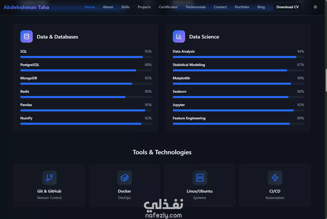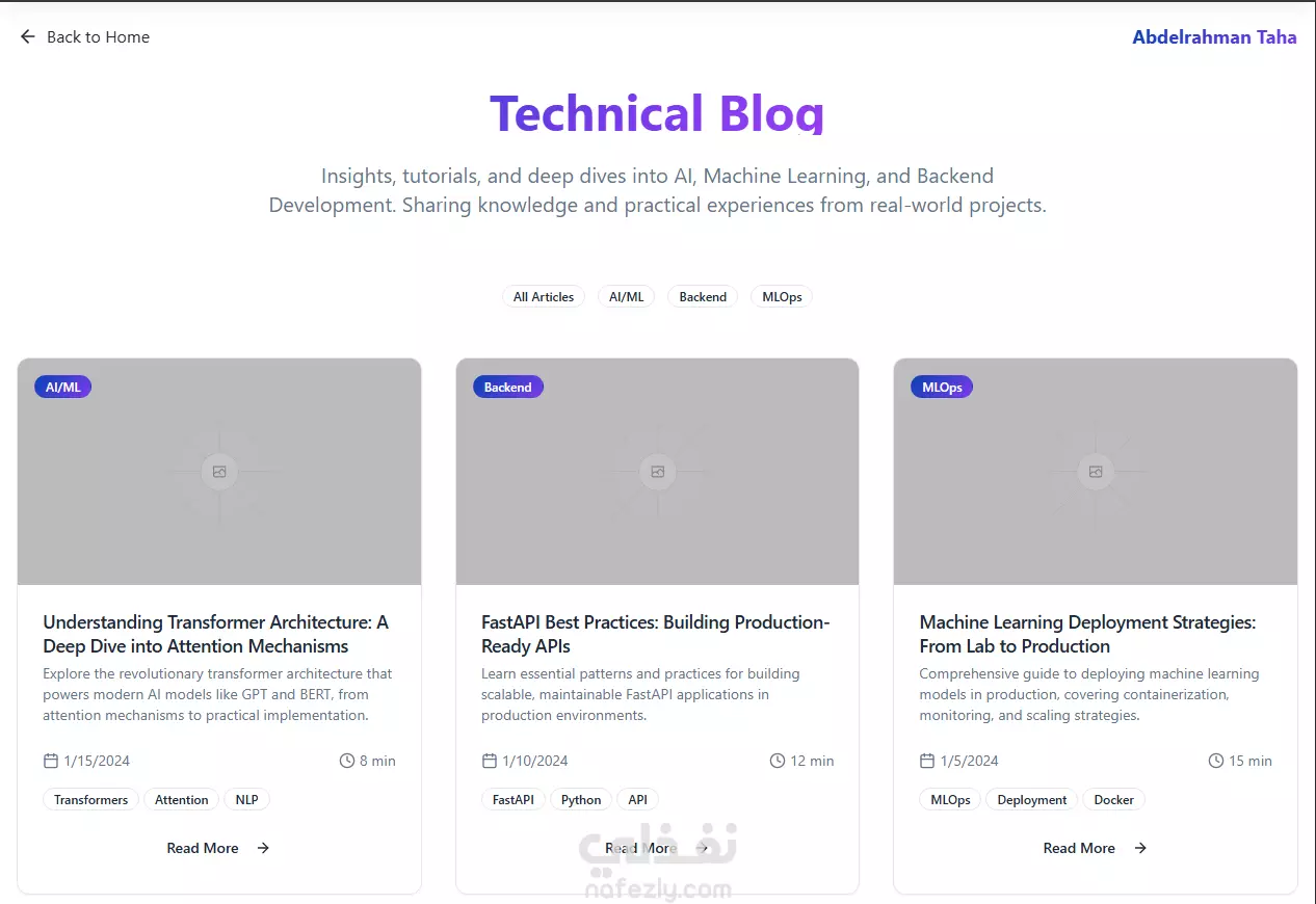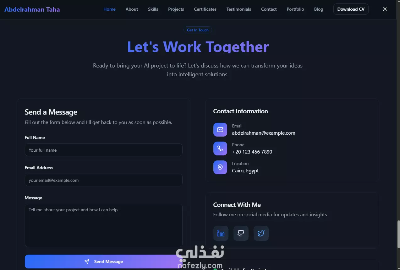 هذا موقع شخصي اللكتروني هو تطبيق واجهة أمامية (Frontend) احترافي، بُني بالكامل باستخدام مكتبة React، مما يضمن أداءً فائق السرعة وتجربة مستخدم سلسة بفضل هيكل التطبيق أحادي الصفحة (SPA). تم تصميم الواجهة لتعكس خبرتي في مجالات الذكاء الاصطناعي وتطوير الـ Backend عبر أقسام منظمة وجذابة. لقد استخدمت نظام المكونات (Components) في React لتحقيق سهولة الصيانة وقابلية التوسع، مع الحرص على تطبيق تصميم مستجيب (Responsive Design) يظهر بشكل مثالي على كافة الأجهزة، مما يجعله نموذجًا حيًا للكود النظيف والممارسات الحديثة.