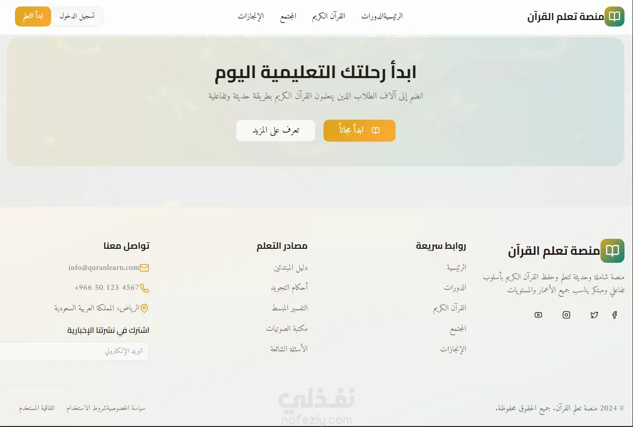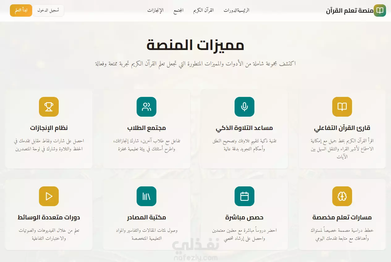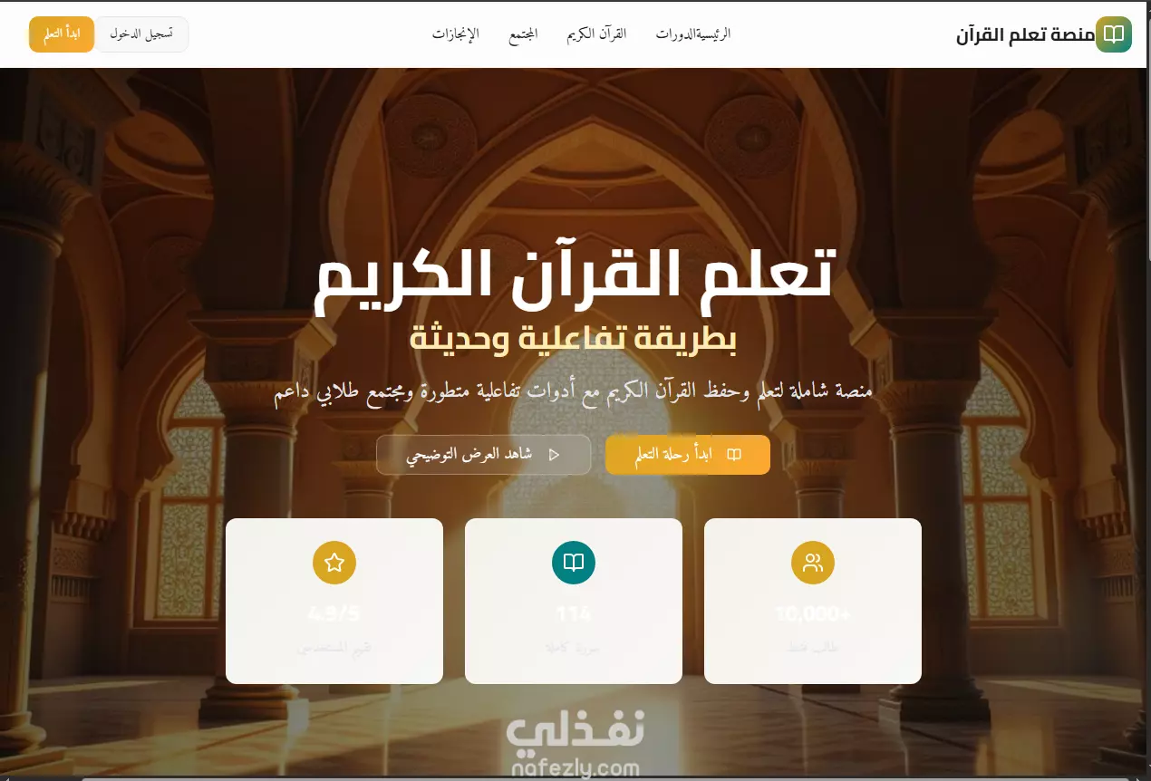 هذه واجهتي الأمامية (Frontend) لمنصة "منصة تعلم القرآن" التعليمية، وقد صممتها لتكون جذابة بصريًا وفعالة تعليميًا. استخدمت ألوانًا مريحة وخلفيات مستوحاة من العمارة الإسلامية لخلق بيئة تعلم هادئة. ركزت في التصميم على إبراز الميزات التفاعلية مثل نظام الإنجازات ووجود مساعد تلاوة ذكي، بالإضافة إلى الإشارة إلى أكثر من 10,000 طالب مسجل لتعزيز الثقة. باختصار، قدمت واجهة حديثة تُحوّل تجربة تعلم القرآن إلى رحلة تعليمية مخصصة ومتعددة الوسائط.