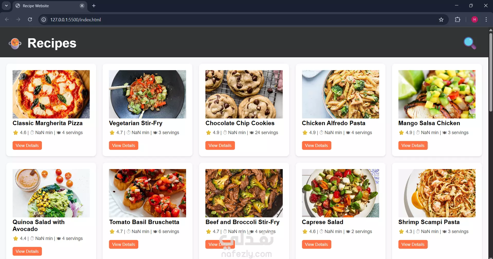 "A recipes website with a search function and detailed view option for step-by-step cooking instructions."