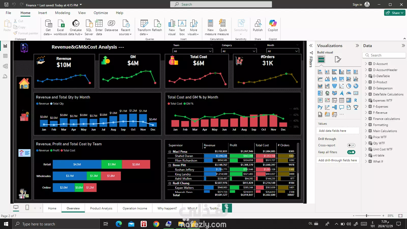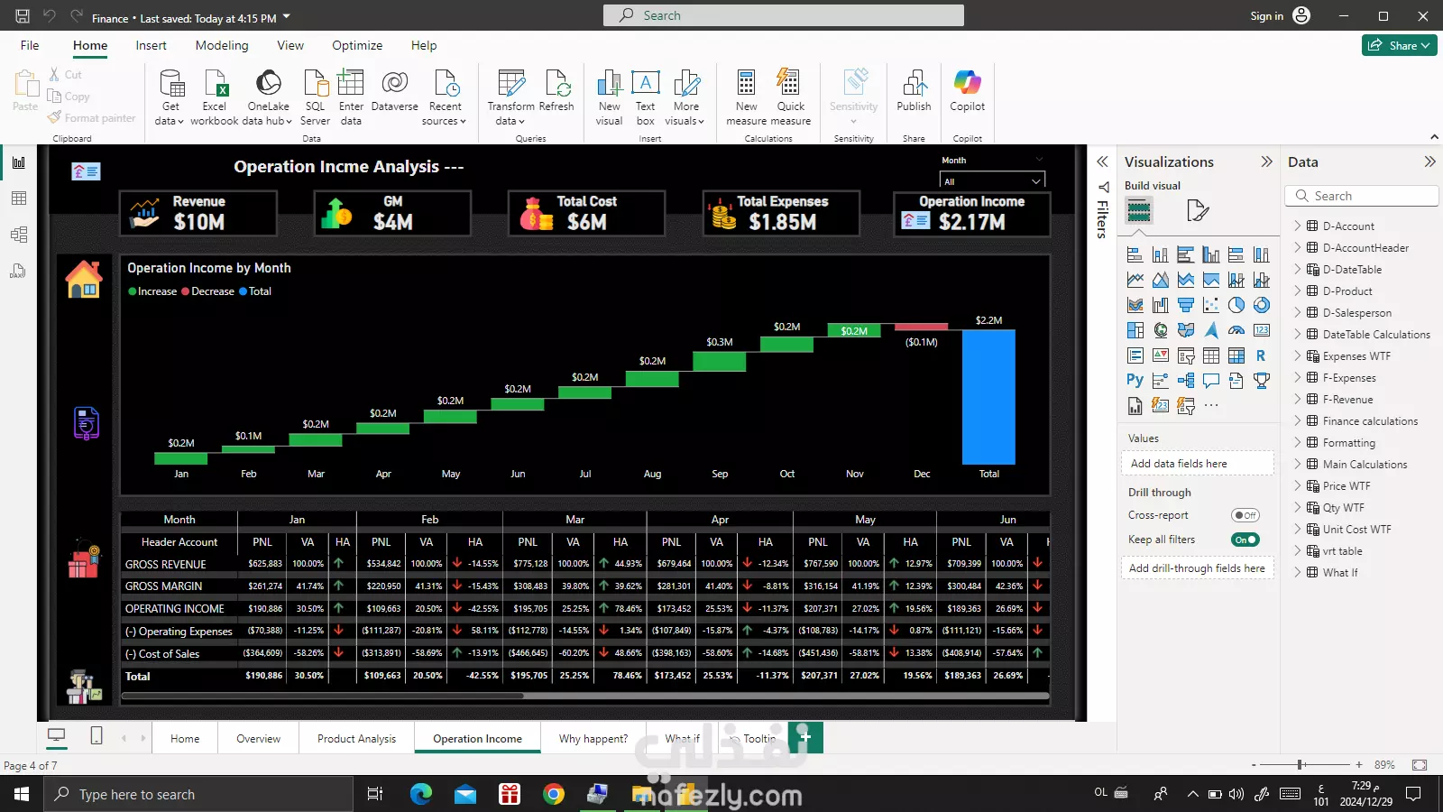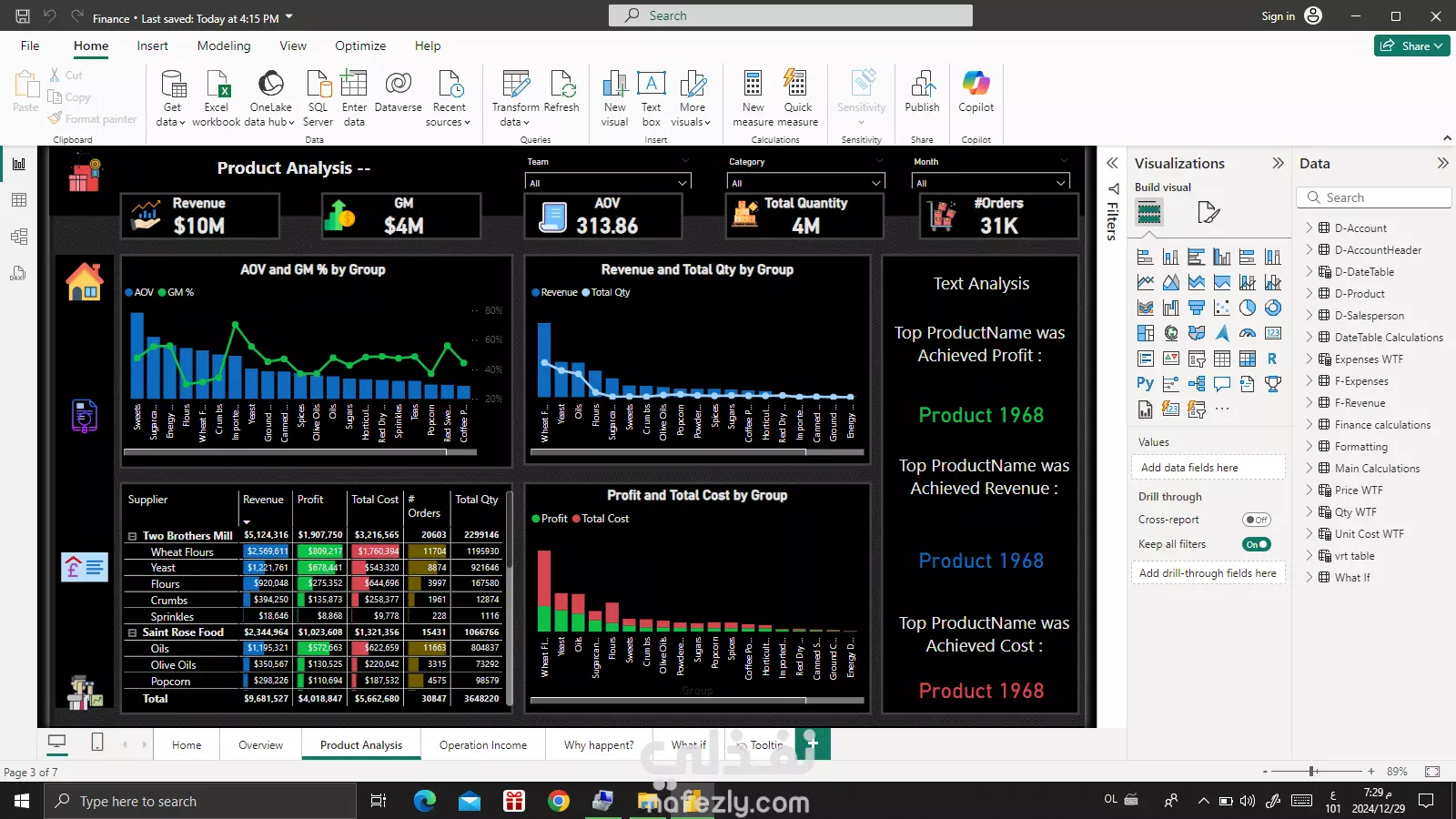 - توضيح معظم مؤشرات الأداء الرئيسية الخاصة ببيانات الماليات مثلا: إجمالي التكاليف, Vertical analysis, Horizontal analysis, PNL, إجمالي المبيعات، اجمالي الارباح، اجمالي الطلبات, إجمالي الكميات، عدد العملاء , Operation income,متوسط قيمة الطلب لكل منتج ، وكذالك مؤشرات اداء اخرى وذلك يعتمد على كمية البيانات المتوفرة.