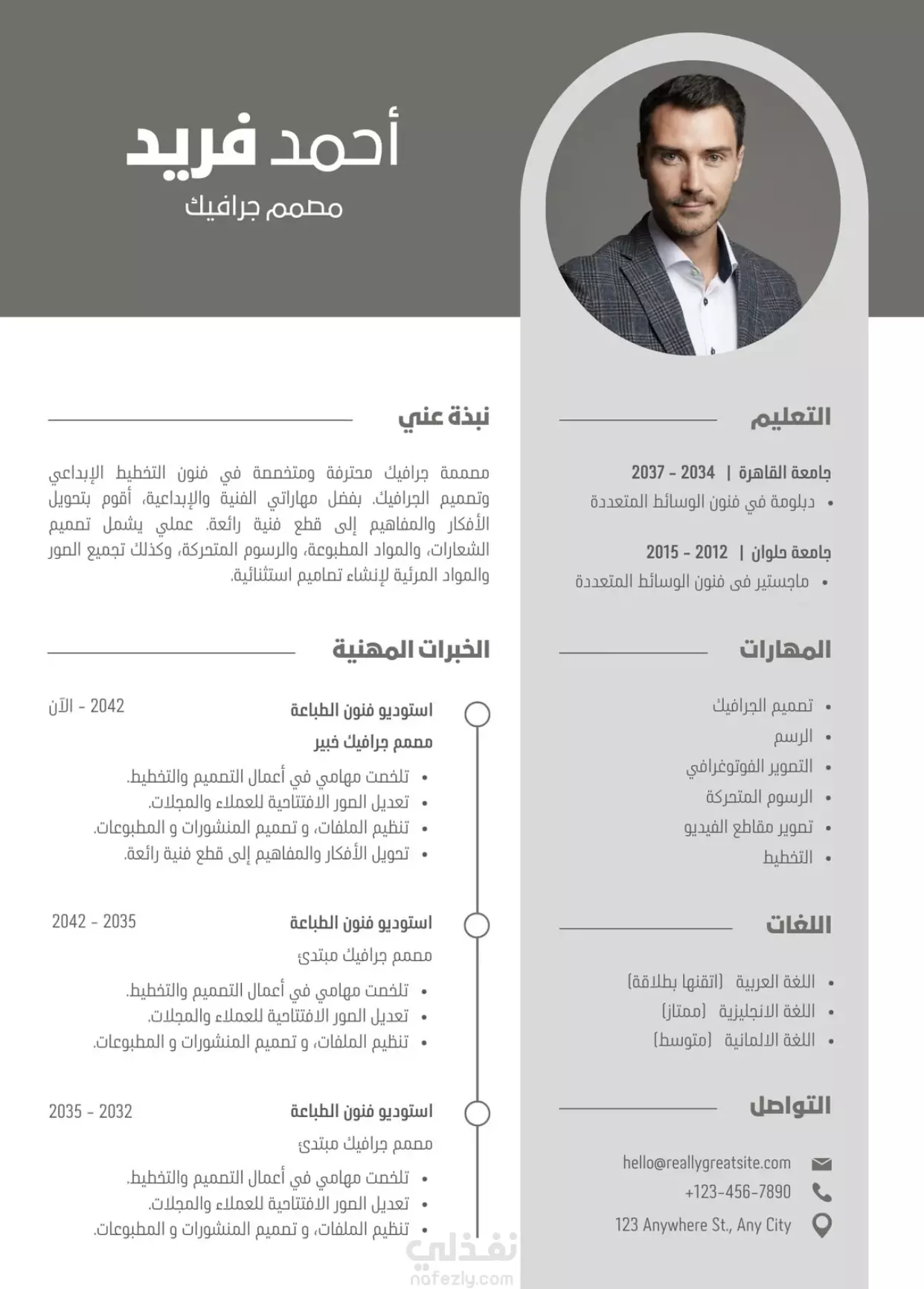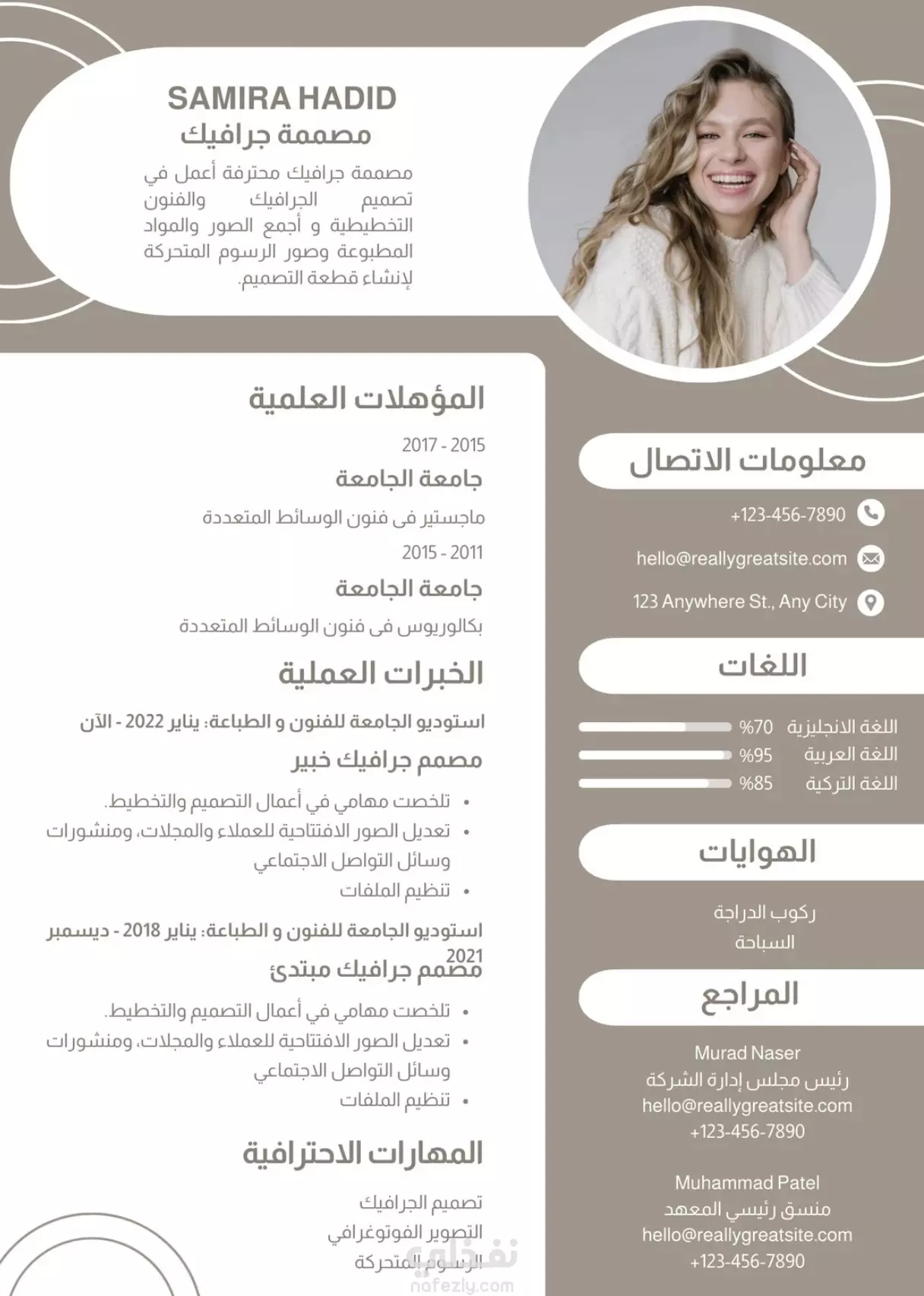 سيرتك الذاتية بطريقة جذابة واحترافية تساعدك على إبراز خبراتك ومهاراتك بشكل واضح ومرتب، مما يزيد فرصك في التوظيف. يستخدم المصمم أدوات وبرامج مثل Canva، Adobe InDesign، Microsoft Word، ويهتم باختيار الألوان والخطوط والتنسيق المناسب لطبيعة عملك، ليضمن سيرة ذاتية منظمة وسهلة القراءة تلفت انتباه أصحاب العمل.