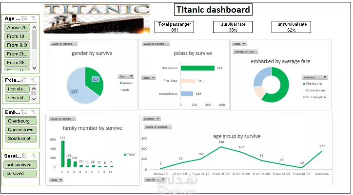 هذا المشروع عبارة عن لوحة تحكم تفاعلية لتحليل بيانات Titanic Dataset، قمت من خلالها بتنظيف البيانات والتعامل مع القيم المفقودة ثم إجراء تحليل استكشافي لإظهار أهم الأنماط والعلاقات داخل البيانات. توضح اللوحة عدد الركاب الإجمالي ونسبة البقاء على قيد الحياة مقابل نسبة عدم النجاة، مما يعطي نظرة شاملة على حجم البيانات ونتائجها الأساسية. تتضمن اللوحة تحليلات تفصيلية مثل مقارنة معدلات النجاة بين الذكور والإناث، وتوضيح الفروق بين درجات السفر المختلفة حيث يظهر بوضوح أن الركاب في الدرجة الأولى كانت لديهم فرص أعلى للبقاء. كما تستعرض العلاقة بين الميناء الذي أبحر منه الركاب ومتوسط الأجرة المدفوعة، إضافة إلى تأثير عدد أفراد الأسرة المرافقين على احتمالية النجاة. أما من ناحية الفئات العمرية، فقدمت اللوحة رؤية بصرية توضح كيف أثّر العمر على نسب البقاء، حيث تظهر بعض المجموعات العمرية فرصًا أكبر في النجاة مقارنة بغيرها. هذا المشروع يعكس قدرتي على ربط خطوات تحليل البيانات (من التنظيف والمعالجة إلى التحليل والعرض البصري) في شكل لوحة تحكم شاملة تسهّل فهم النتائج ودعم عملية اتخاذ القرار.