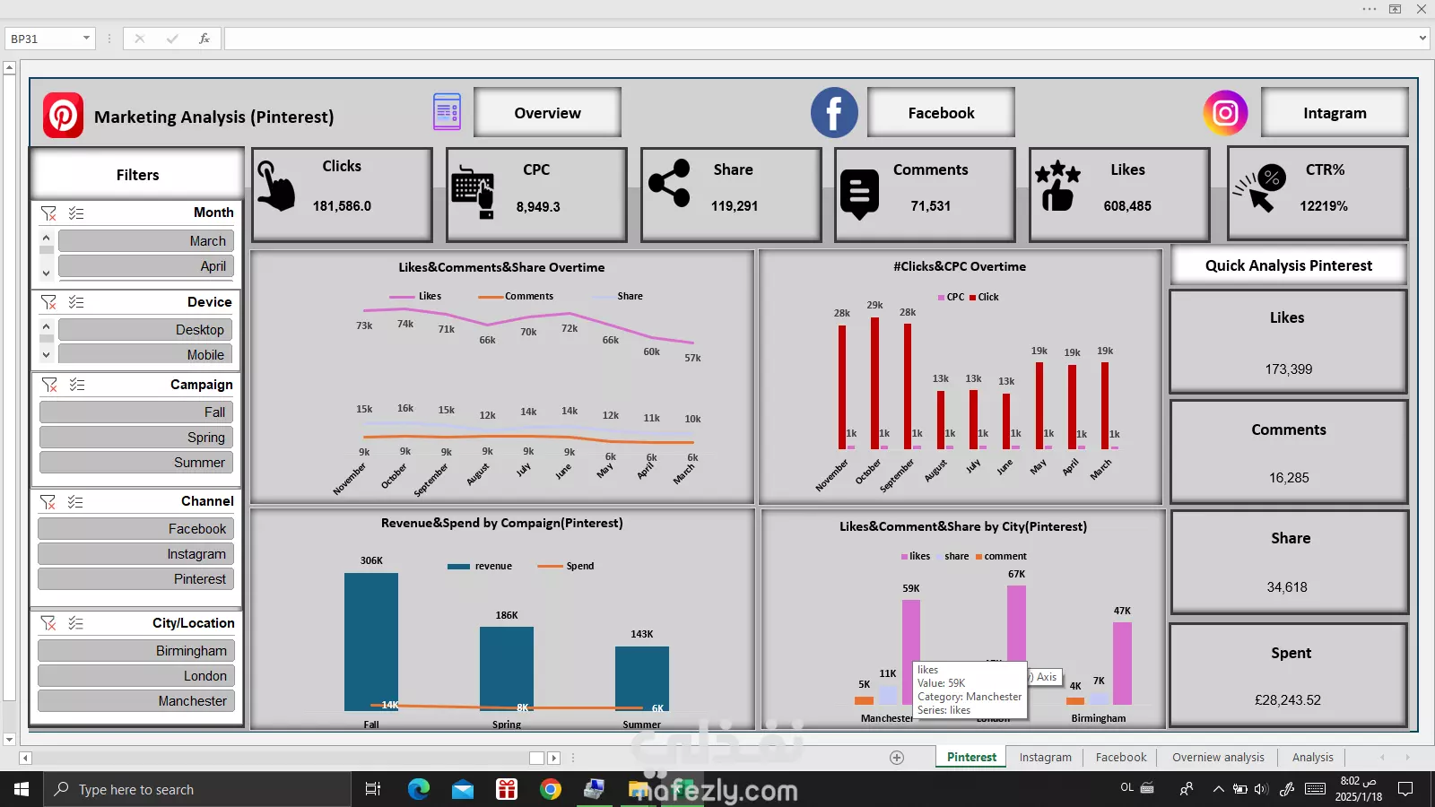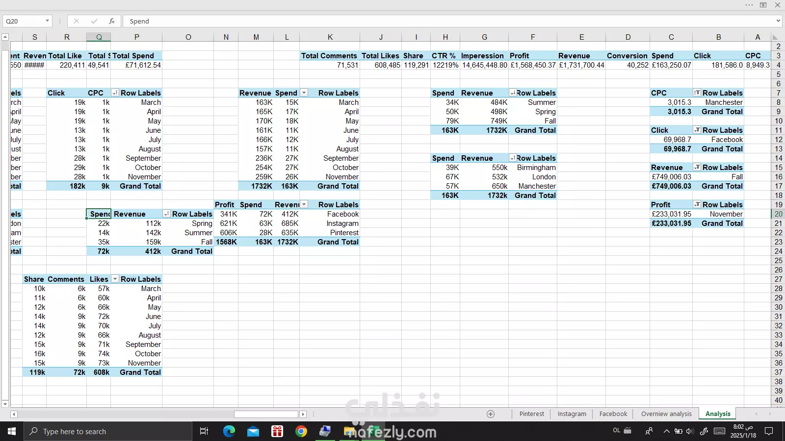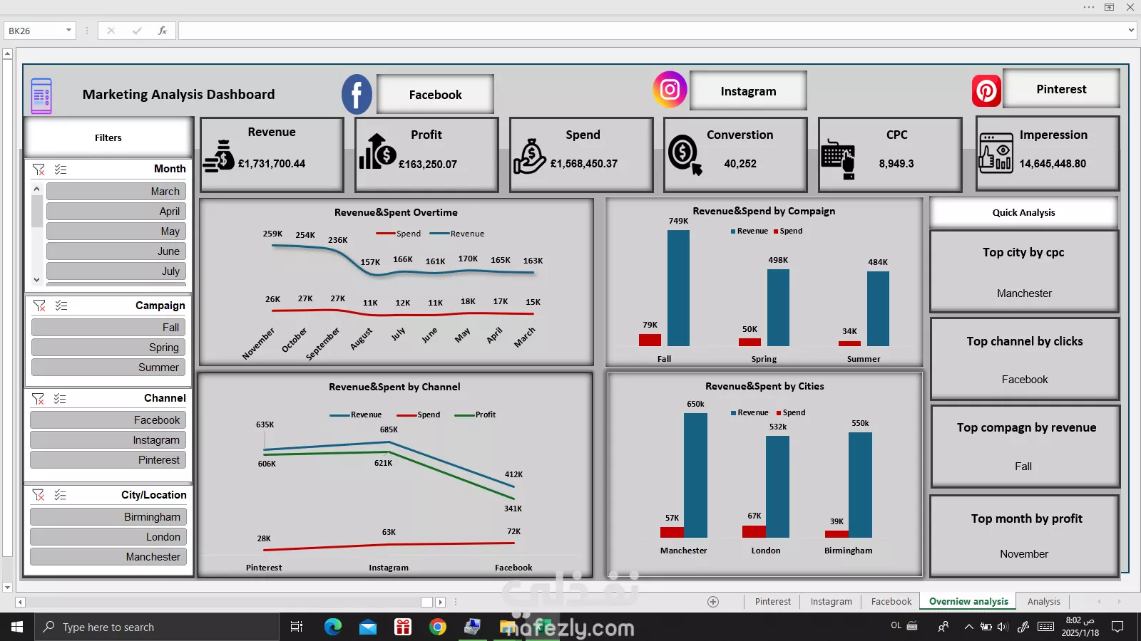 - عرض مؤشرات الأداء الرئيسية مع كل بعد تريد معرفته مثلا عدد اللايكات مع كل قناة ، اجمالي الارباح مع كل قناة ،إجمالي الارباح لكل مدينة، إجمالي المبيعات في كل فصل من فصول السنة، وما شابه ذلك.