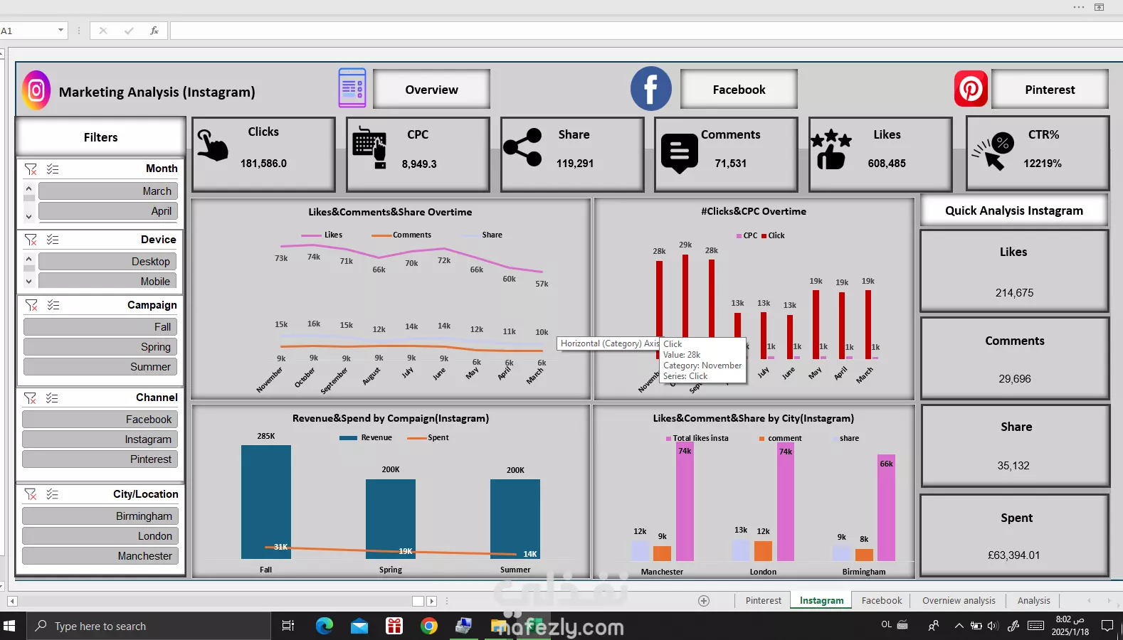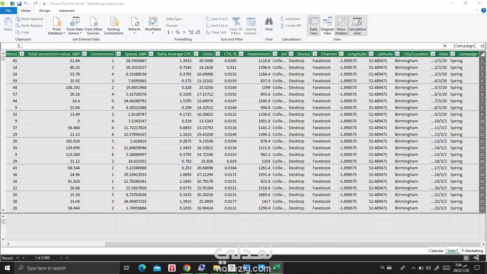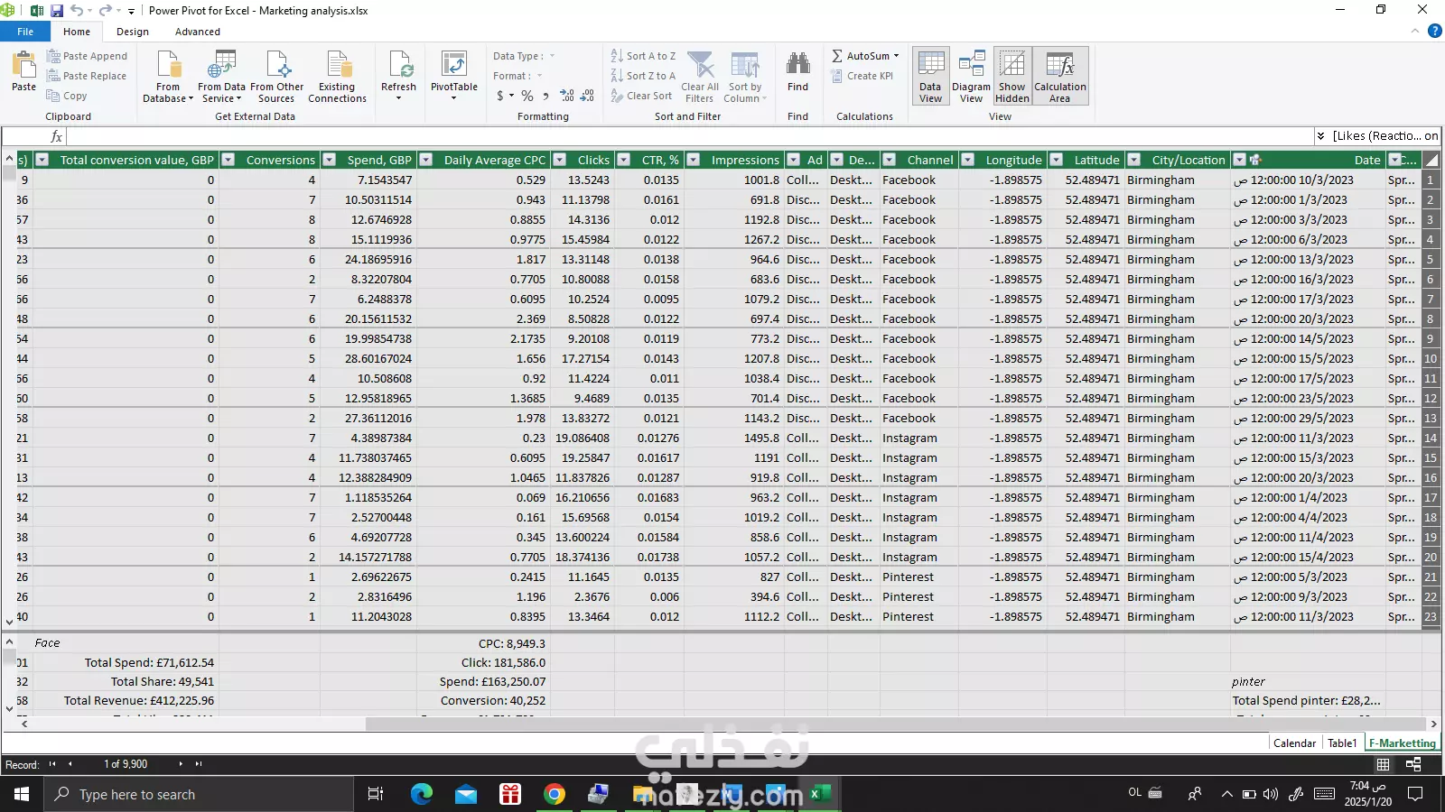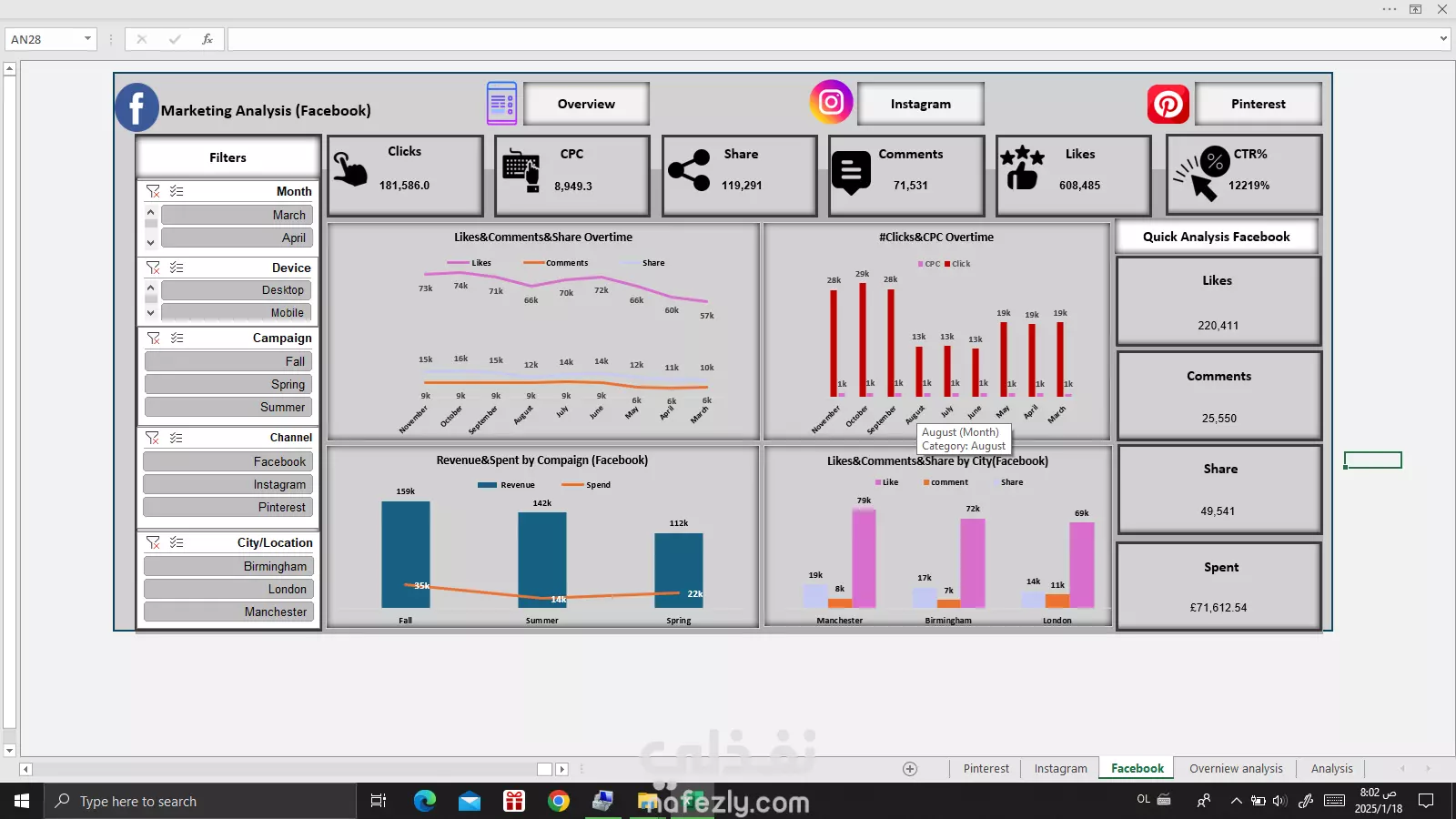 - توضيح معظم مؤشرات الأداء الرئيسية الخاصة ببيانات التسويق مثلا revenue, profits, costs, spend, conversion, CPC, CTR%, Total impression, Number of clicks, number of likes, number of comments, and number of shares وكذالك مؤشرات اداء اخرى وذلك يعتمد على كمية البيانات المتوفرة .