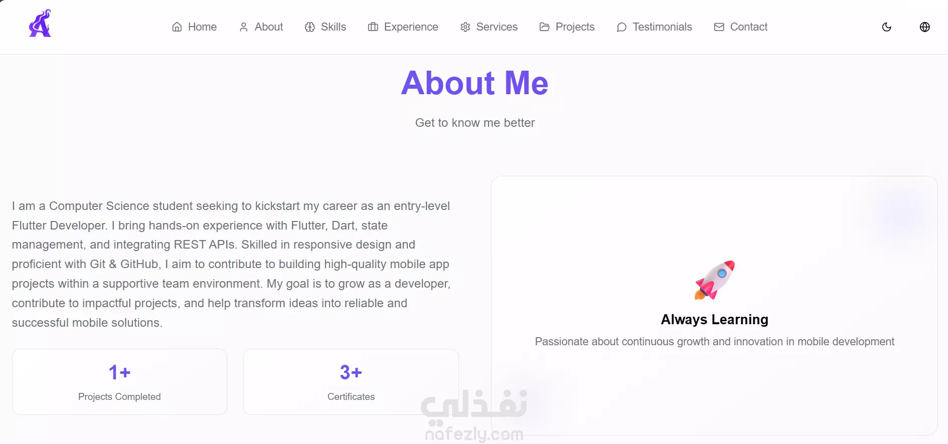 الصفحة الرئيسية: ترحيب + تعريف قصير بالمطور.