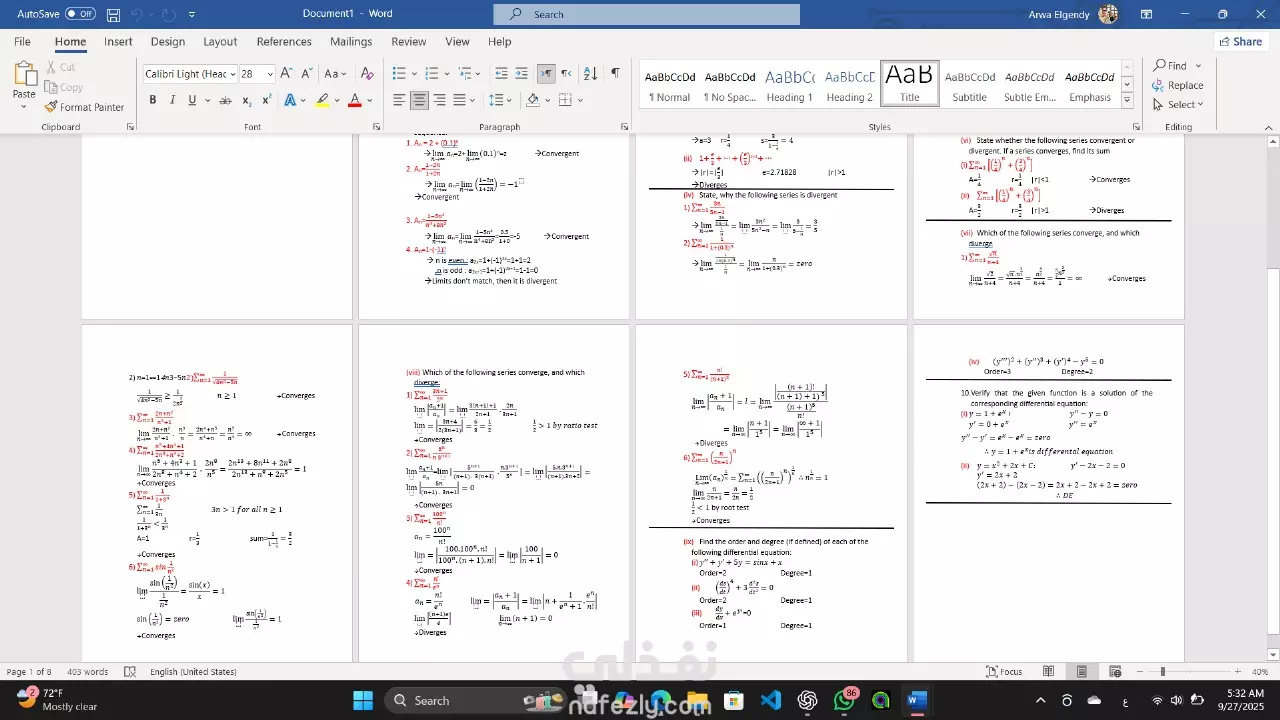 مت بالعمل على ملف Word يحتوي على مجموعة من المسائل الحسابية، وتم إنجاز الآتي: