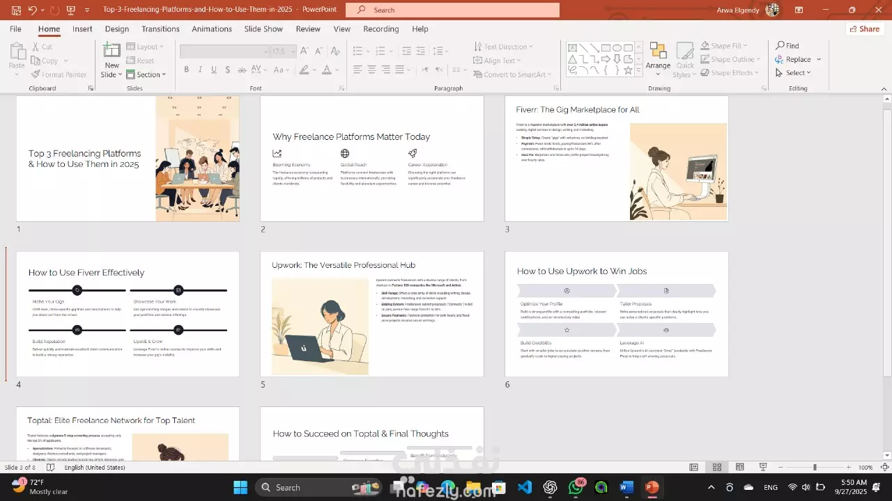 قمت بإنشاء عرض تقديمي باستخدام PowerPoint وتم إنجاز الآتي: تصميم شرائح احترافية مناسبة لموضوع العرض. تنسيق النصوص والعناوين بخطوط واضحة وألوان متناسقة. إضافة الصور والأيقونات التوضيحية عند الحاجة. استخدام حركات وانتقالات بسيطة واحترافية لزيادة جاذبية العرض. تنظيم الشرائح بشكل منطقي ومتسلسل ليسهل على القارئ أو المستمع المتابعة. تسليم الملف بصيغة PPTX، مع إمكانية حفظ نسخة بصيغة PDF إذا رغب المشتري.