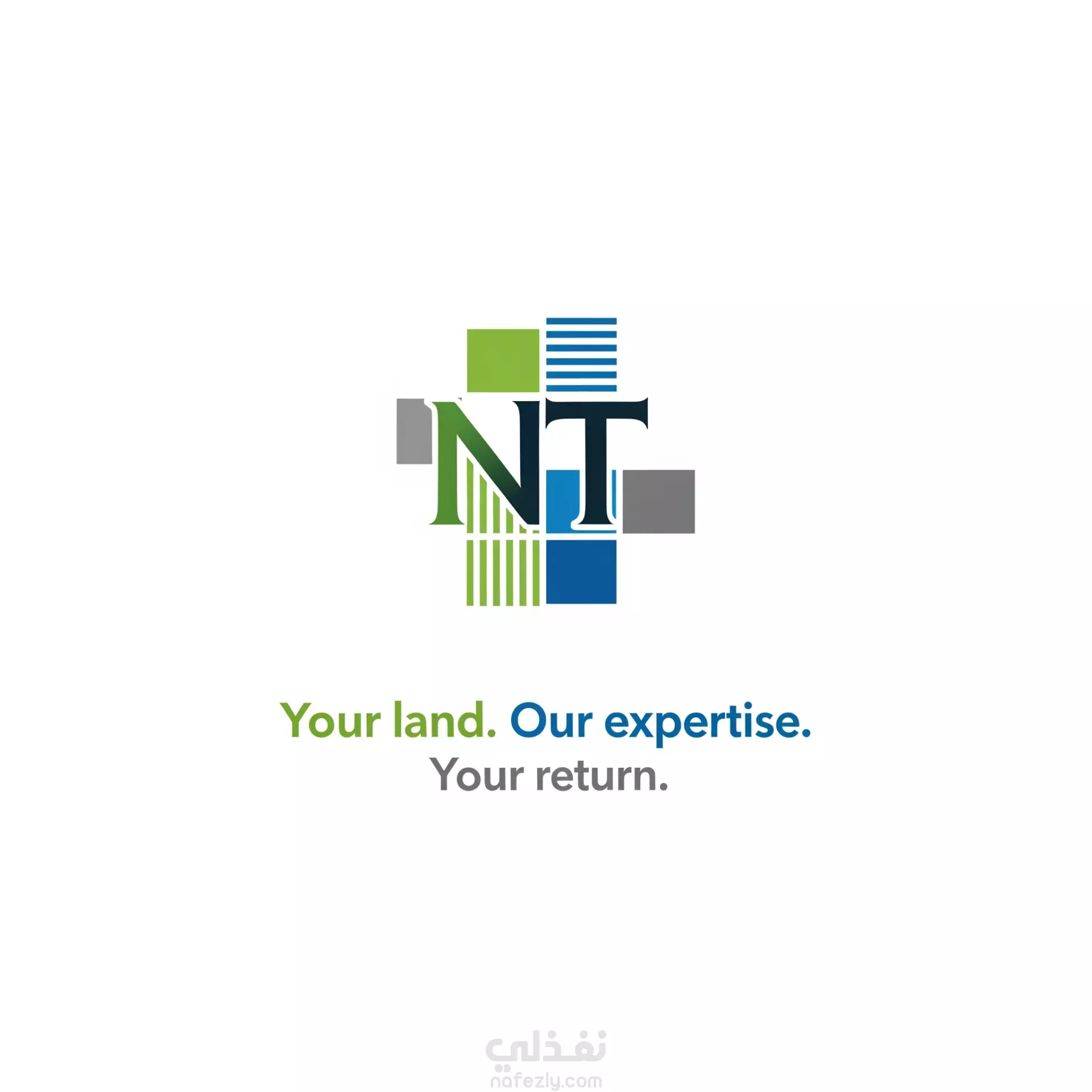 شعار بسيط، هندسي، يتكون من مربعات/خطوط مقسمة بشكل أنيق، مع دمج اسم الشركة (NT). النسخة الثانية تتضمن الشعار النصي: "أرضك. خبرتنا. عائدك." بالألوان المقترحة (أخضر، أزرق، رمادي).