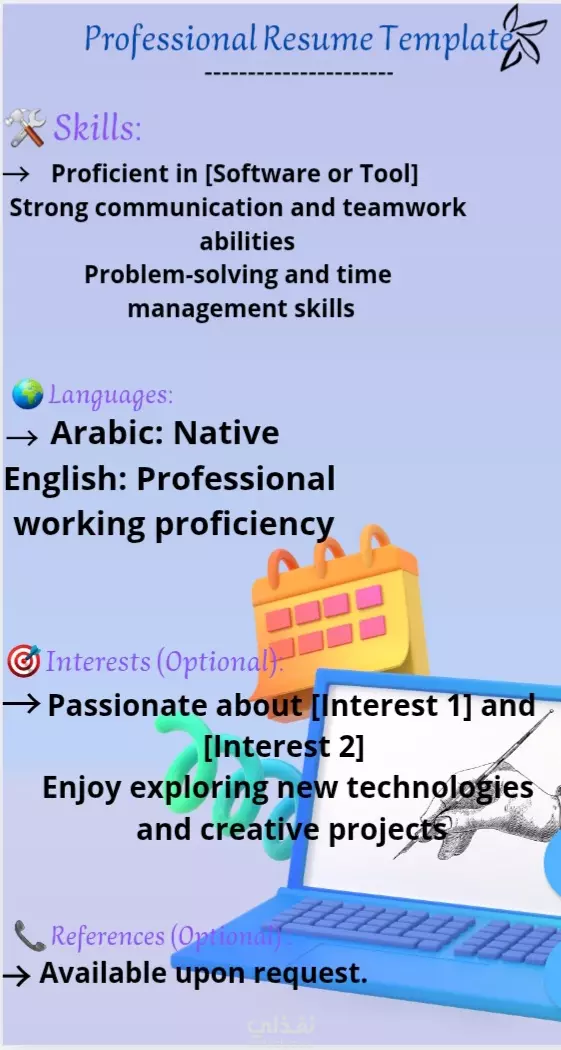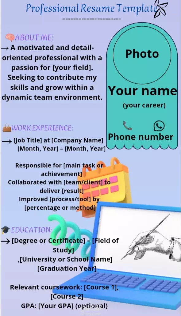 تصميم شكل عام لسيرة ذاتية باستخدام canva . تم تصميمه بدقة واحترافية ليتناسب مع اي شخص (طالب، موظف،...). اتمنى أن ينال إعجابكم.