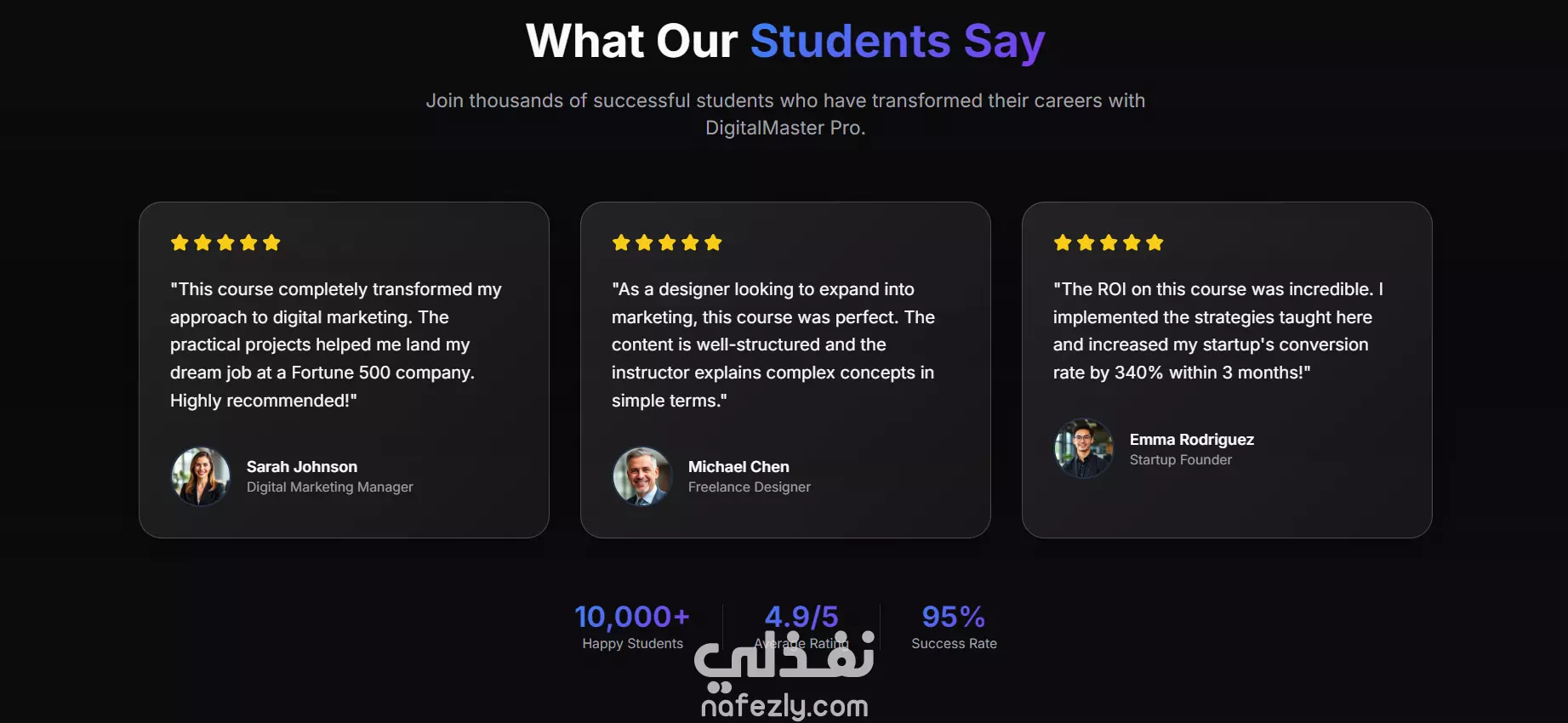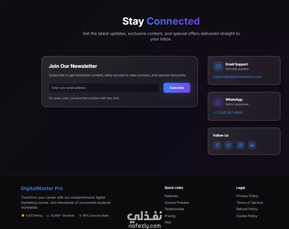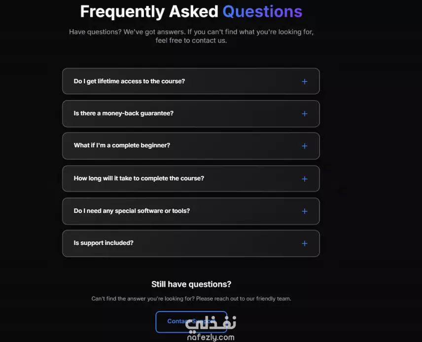 -أقسام متنوعة: مقدمة (Hero)، مميزات المنتج، معاينة المنتج، شهادات العملاء، التسعير، الأسئلة الشائعة، التواصل.
