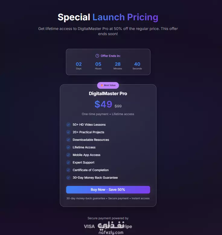 -أزرار Call to Action واضحة (شراء، تجربة مجانية). -عداد وقت (Countdown Timer) لعرض محدود.