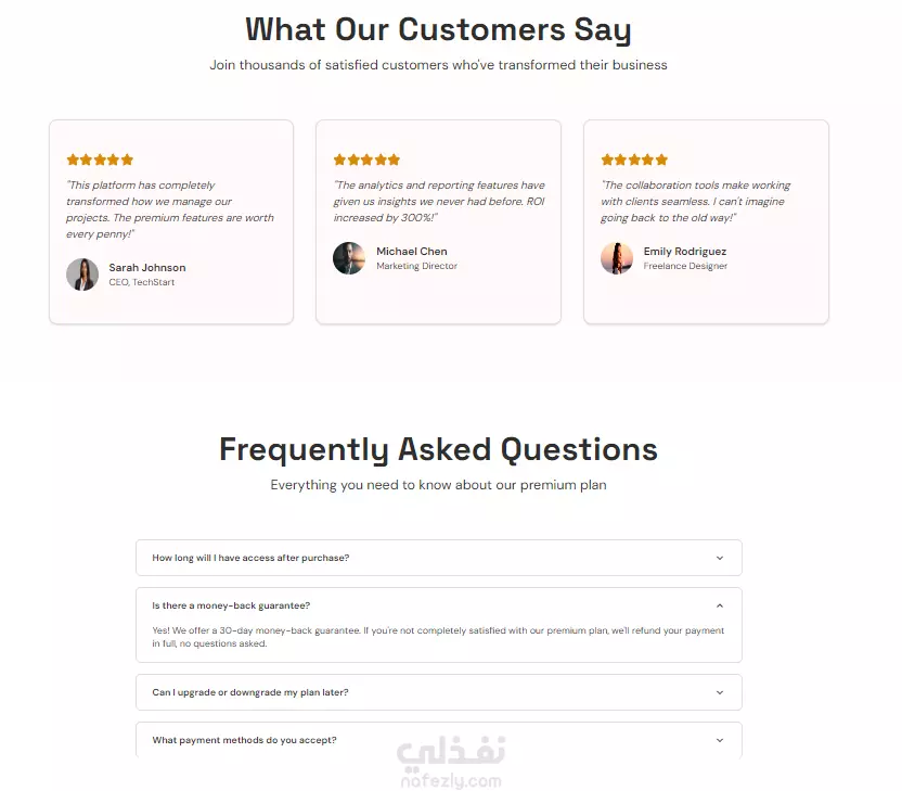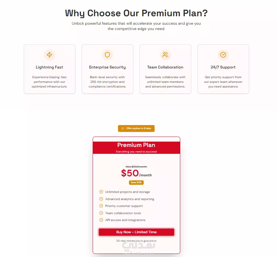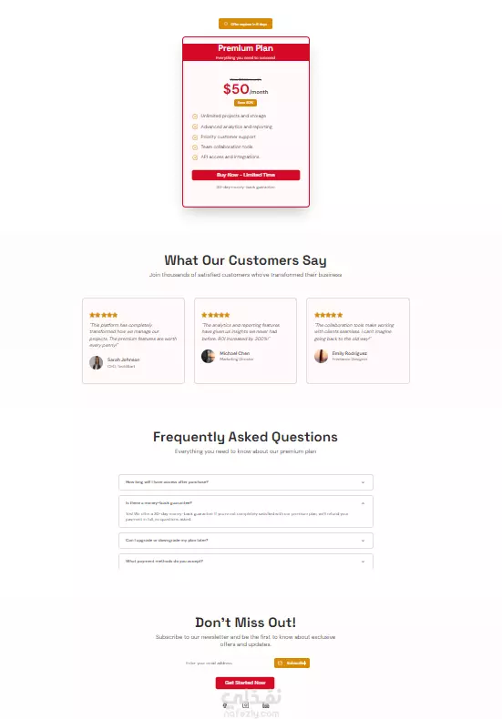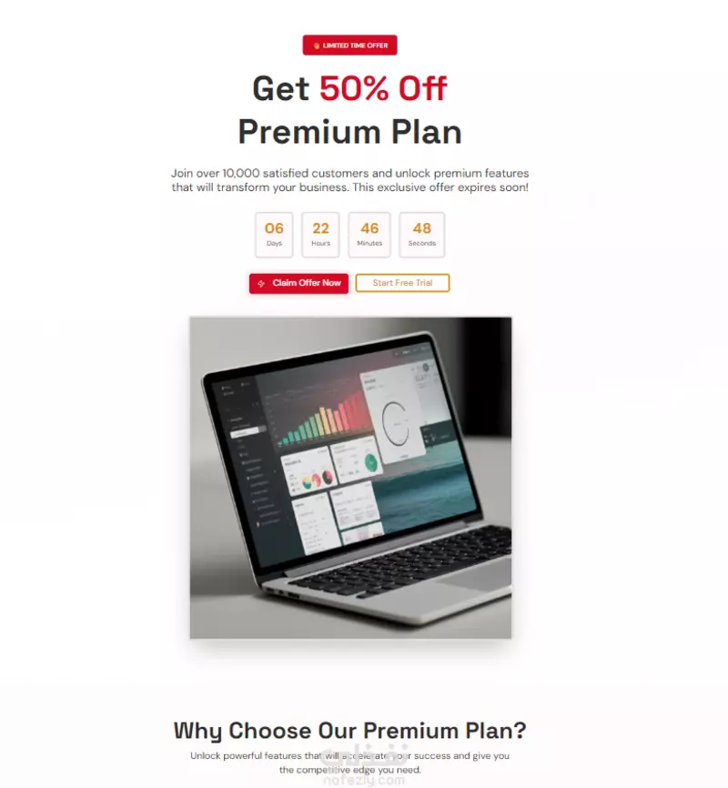 -أقسام متنوعة: مقدمة (Hero) مع عداد وقت، مميزات العرض، تفاصيل العرض والتسعير، شهادات العملاء، الأسئلة الشائعة، التسجيل/التواصل، وتذييل الصفحة. -أزرار Call to Action واضحة وملفتة للنظر ("Claim Offer Now"، "Free Trial").