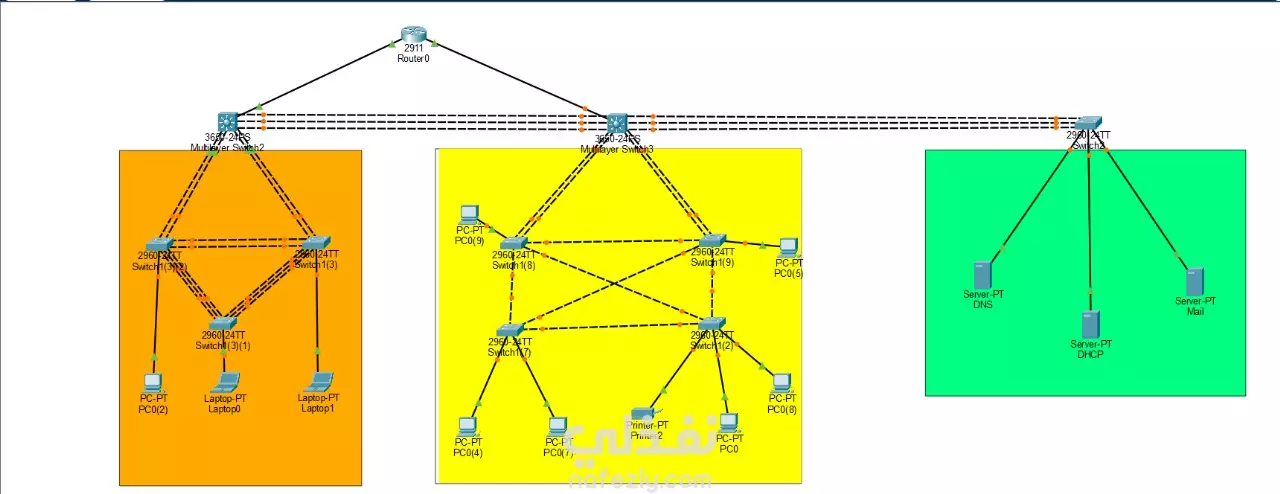 A full network topology for an it company, using vlan and inter-vlan technologies.