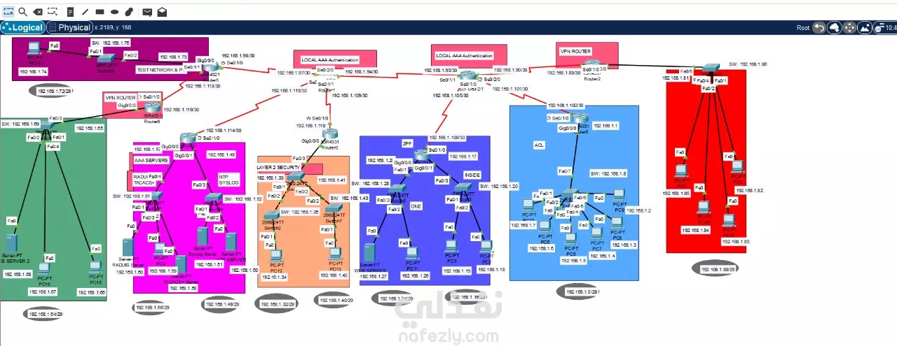 تصميم وتنفيذ شبكة متكاملة لمؤسسة تحتوي على عدة أقسام (خوادم – مستخدمين – DMZ – Inside – VPN) مع تطبيق سياسات أمنية متقدمة لضمان حماية البيانات والتحكم في الوصول