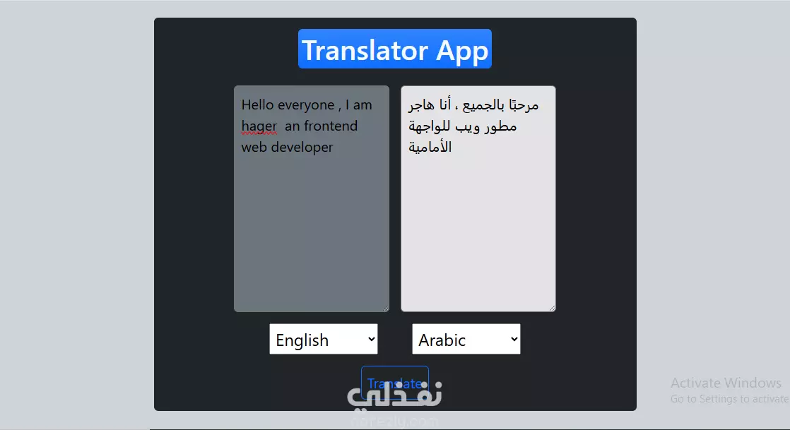 هو تطبيق ويب بسيط يقدّم خدمة الترجمة بين لغات مختلفة. المستخدم يدخل نصًا، ويطلب ترجمته إلى لغة أخرى، ويحصل على النص المترجم في الحال , ديزاين سهل ومتجاوب على جميع الشاشات Responsive on all screens