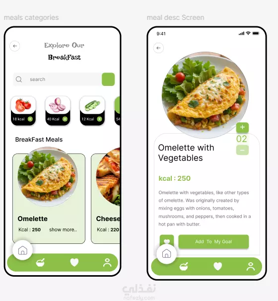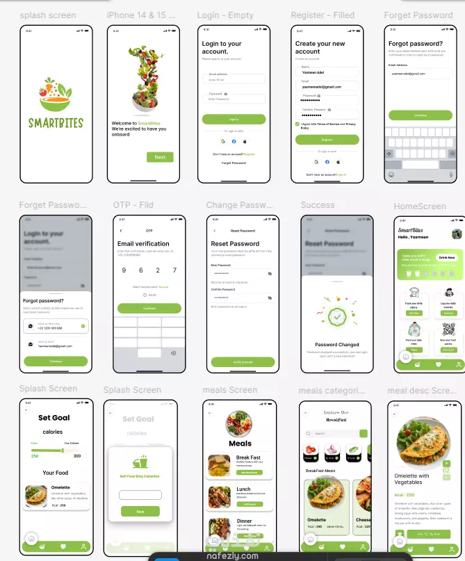 تطبيق SmartBites هو تطبيق لتتبع السعرات الحرارية وإدارة الوجبات، مُصمم لمساعدة المستخدمين على تحقيق أهدافهم الغذائية. يتضمن التطبيق شاشات متعددة للتسجيل والدخول، بالإضافة إلى لوحة تحكم تعرض ملخصًا يوميًا للسعرات المستهلكة. كما يتيح للمستخدمين تحديد أهدافهم الغذائية وتصفح قوائم وجبات مفصلة (مثل الفطور والغداء)، مع عرض معلومات كل وجبة والسعرات الحرارية الخاصة بها. التصميم يركز على الوضوح والبساطة، مع واجهات نظيفة وألوان هادئة، مما يجعل تجربة المستخدم سهلة ومباشرة.
