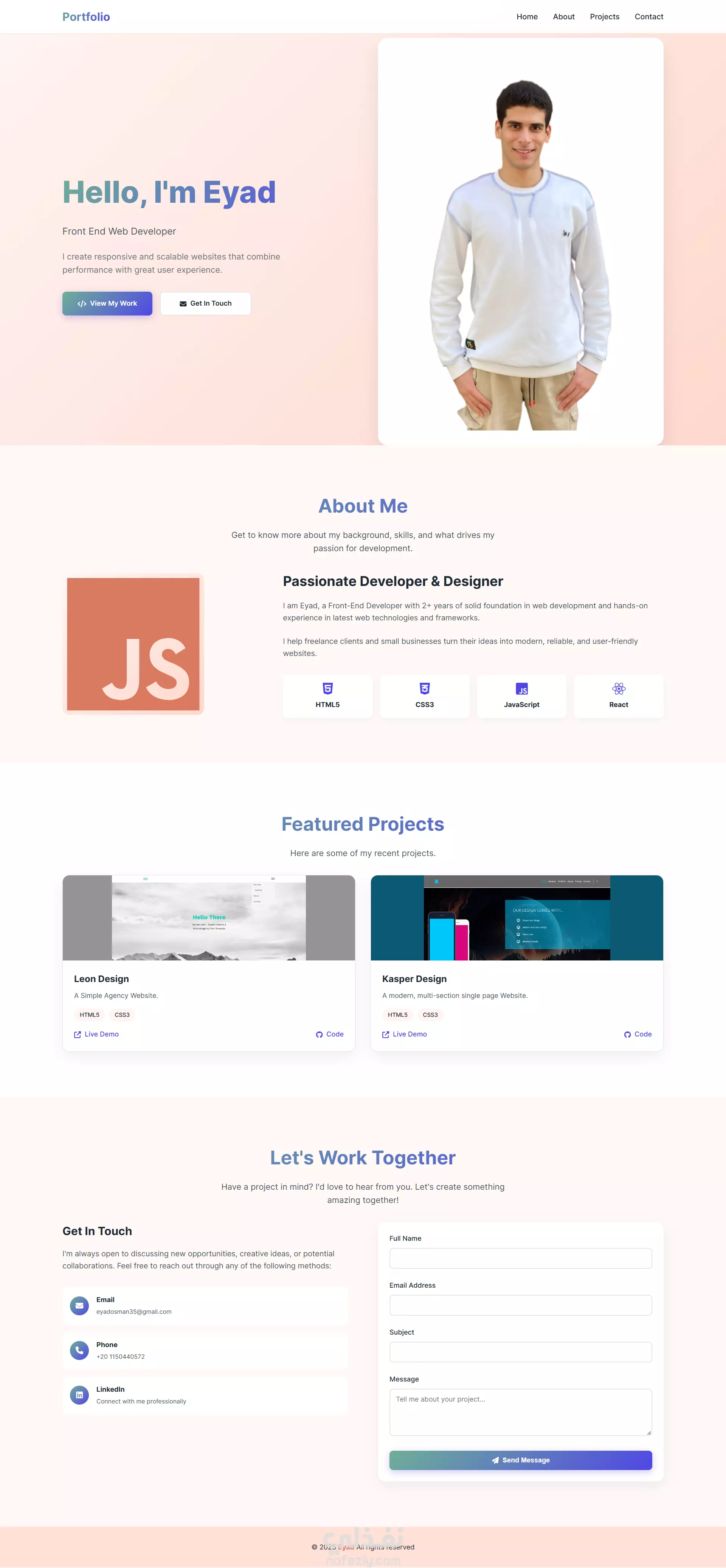 موقع شخصي احترافي (Personal Portfolio) مصمم كصفحة واحدة، يهدف إلى عرض مهاراتي وأعمالي كمطوّر واجهات أمامية (Front-End Developer). الموقع مطوّر باستخدام HTML5، CSS3 مع تصميم متجاوب (Responsive) يعمل بسلاسة على جميع الأجهزة.