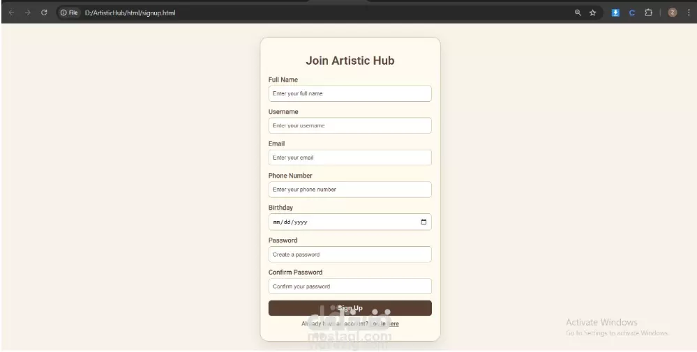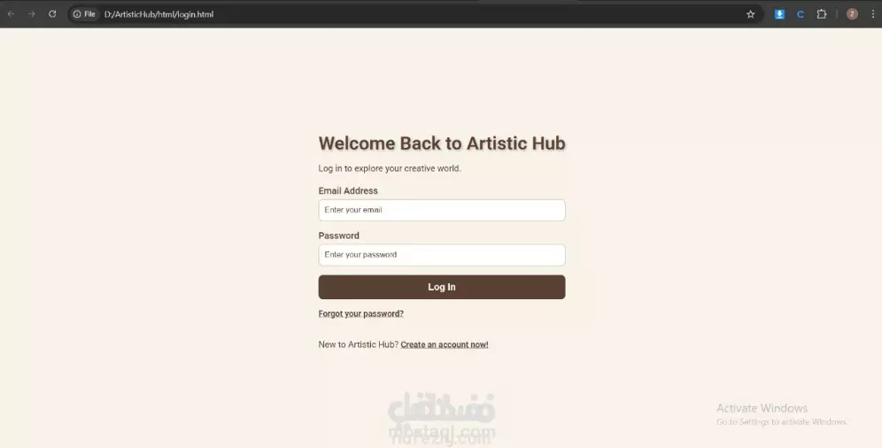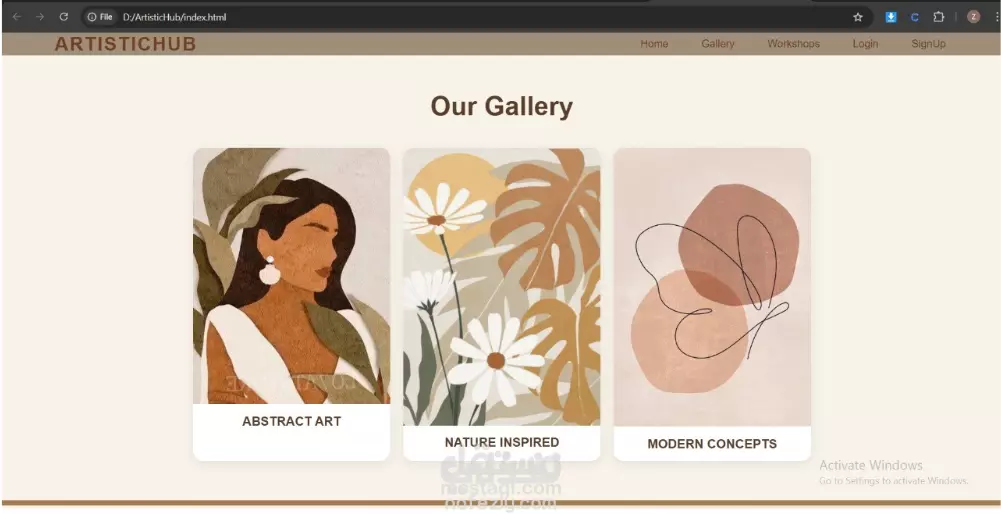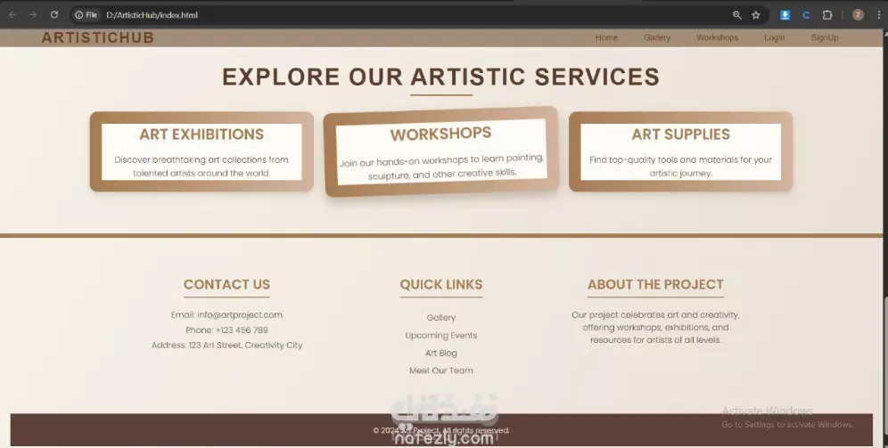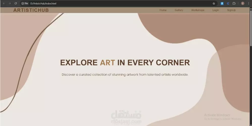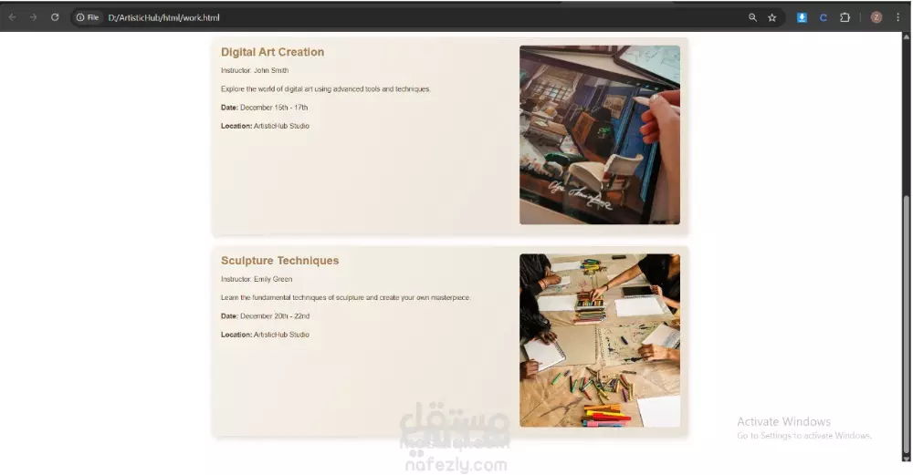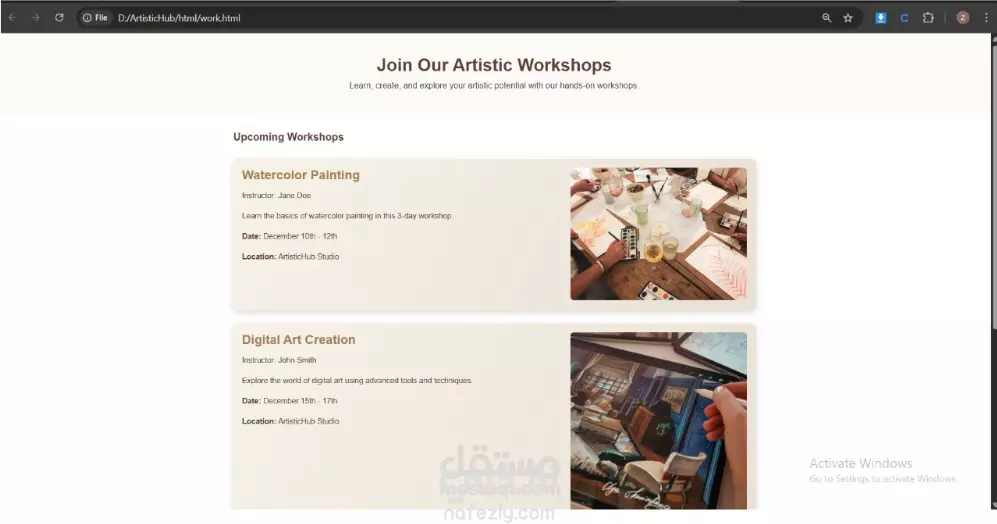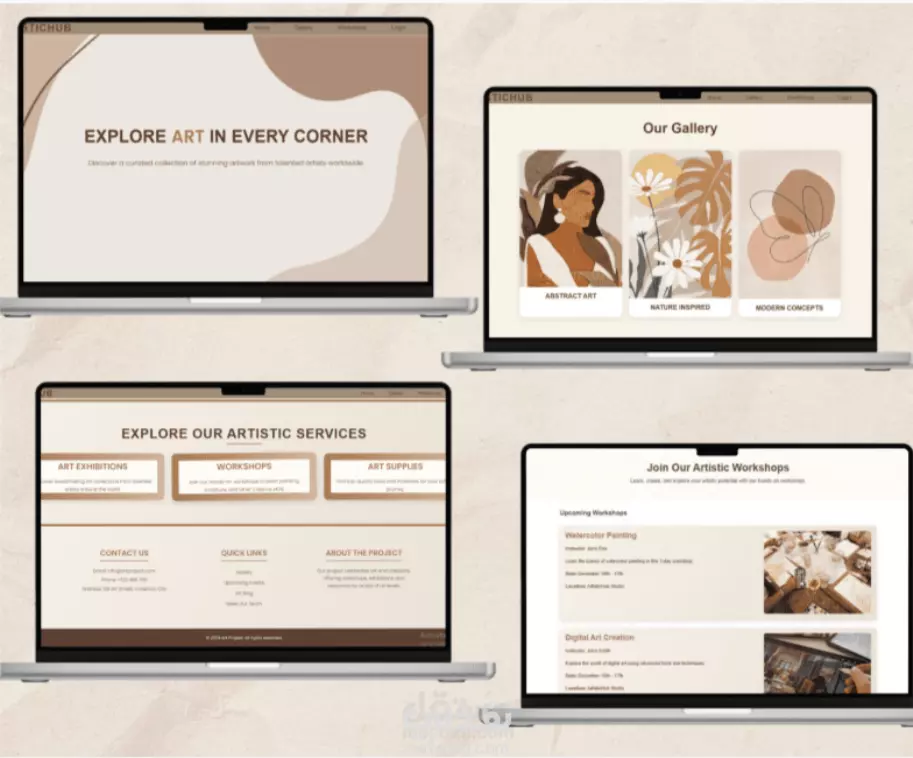 موقع ويب تفاعلي متعدد الصفحات يتيح للمستخدمين استكشاف الفن العالمي والانضمام إلى ورش العمل الفنية. يضم الموقع صفحات: الرئيسية، المعرض (Gallery)، ورش العمل (Workshops)، تسجيل الدخول والتسجيل، مع تصميم متجاوب وسلس يضمن تجربة مستخدم ممتازة. تم التركيز على واجهة مستخدم واضحة وعصرية، وعرض المحتوى بطريقة منظمة وجذابة.