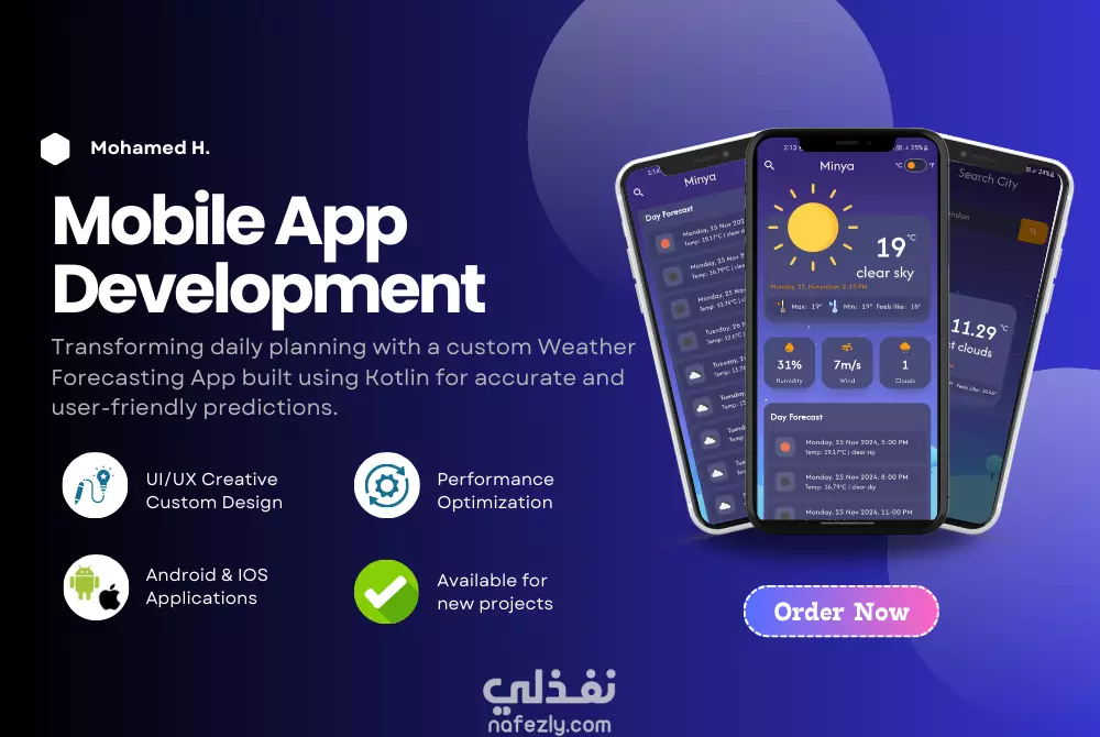 وصف المشروع: تطبيق توقعات الطقس مصمم لتزويد المستخدمين بمعلومات دقيقة ومحدثة عن حالة الطقس في مواقعهم المفضلة. يوفر التطبيق ميزات تساعد المستخدمين على اتخاذ قرارات يومية بناءً على الظروف الجوية، مثل درجات الحرارة، احتمالات هطول الأمطار، ونسب الرطوبة، مع إضافة تنبيهات لحالات الطقس القاسية. ميزات التطبيق: • تحديثات آنية للطقس: يعرض التطبيق حالة الطقس الحالية ودرجات الحرارة مع تحديثات منتظمة. • توقعات مفصلة للأيام المقبلة: يتضمن التوقعات اليومية للأيام القادمة ليسهل على المستخدم التخطيط المسبق. • تنبيهات الطقس القاسي: إشعارات خاصة للتنبيه بحالات الطقس الشديدة، مثل العواصف أو الأمطار الغزيرة. • واجهة مستخدم سهلة وجذابة: تصميم بسيط وعملي يعرض المعلومات بشكل واضح وسهل التصفح. التقنيات المستخدمة: • Firebase: لتخزين البيانات وتحديثها في الوقت الفعلي. • لغة Flutter: لتقديم أداء عالٍ وتجربة مستخدم سلسة على منصات Android وiOS. • تكامل مع خدمات الطقس: يعتمد التطبيق على مصادر موثوقة لجلب البيانات الدقيقة حول حالة الطقس. أؤكد على تقديم تجربة مستخدم فريدة وتصميم حديث لضمان تفاعل المستخدمين ورضاهم عن التطبيق.