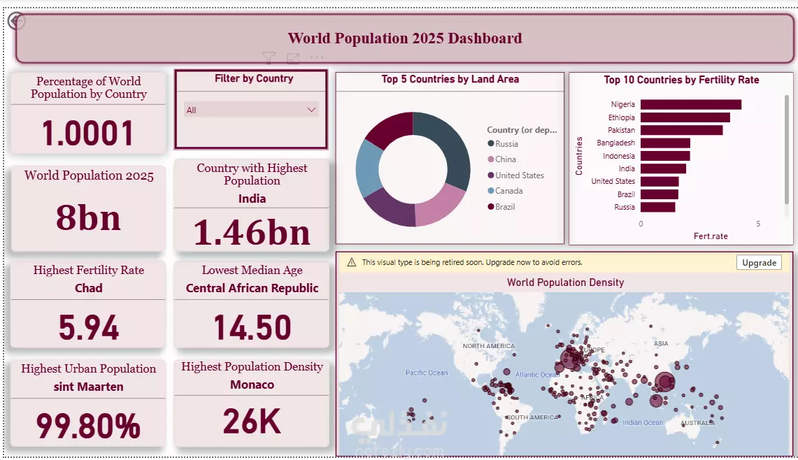 لوحة معلومات تفاعلية باستخدام Power BI لعرض وتحليل الاتجاهات السكانية عالميًا. تعرض اللوحة معدلات النمو السكاني السنوي، والتغير الصافي في عدد السكان، بالإضافة إلى أنماط الهجرة (موجبة، سالبة، أو متعادلة). كما تسلّط الضوء على نسب التحضر بين الدول من خلال مقارنة السكان الحضريين والريفيين. تساعد الرسوم البيانية والخرائط في تبسيط المقارنات واكتشاف الاتجاهات الديموغرافية العالمية. بالإضافة إلى ذلك، تحتوي اللوحة على خريطة توضّح الكثافة السكانية عالميًا، مع إبراز أكبر 10 دول من حيث عدد السكان، وأعلى الدول في معدلات الخصوبة.