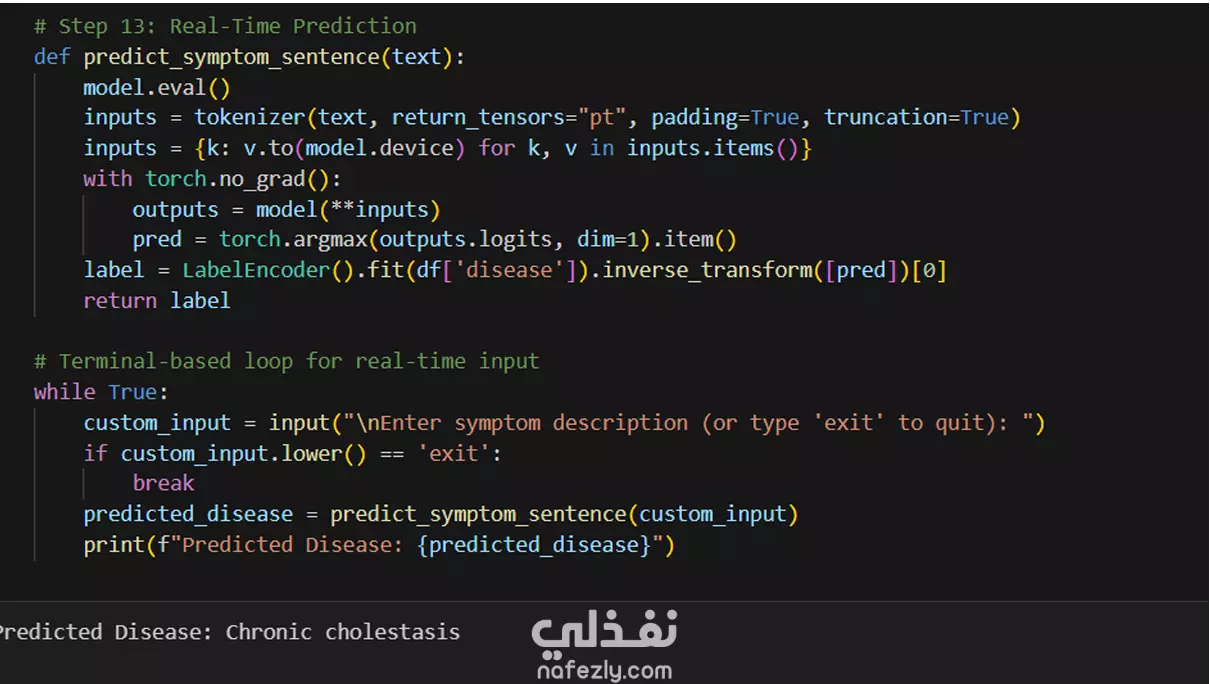 قمتُ بتطوير نموذج ذكي يعتمد على تقنيات معالجة اللغة الطبيعية (NLP) لبناء شات بوت طبي قادر على فهم أوصاف الأعراض النصية وتشخيص الأمراض بدقة عالية، وذلك ضمن منصة طبية متكاملة.