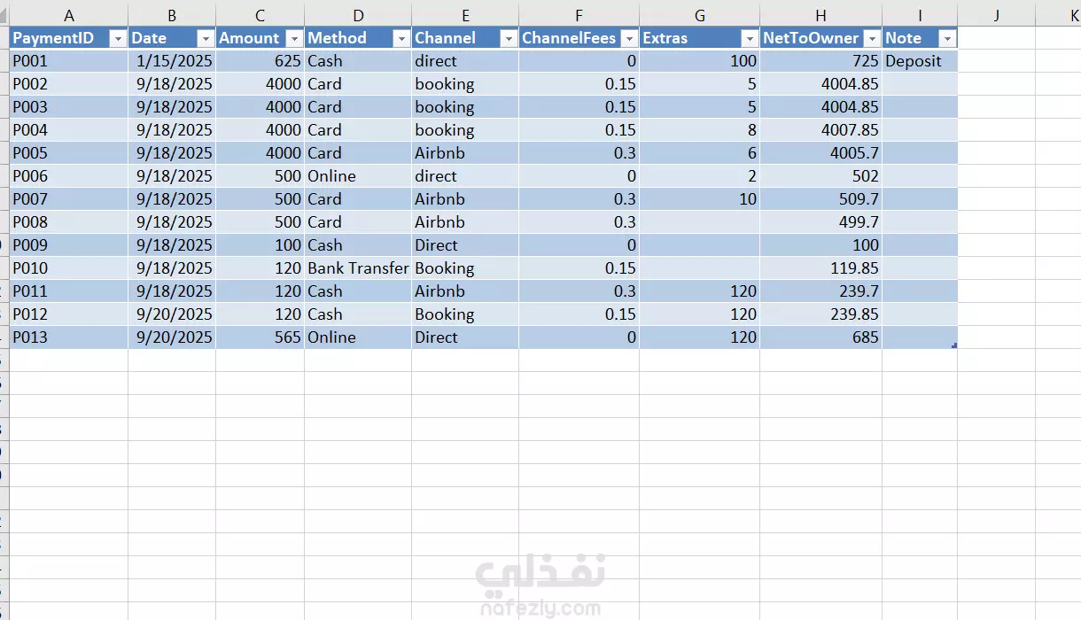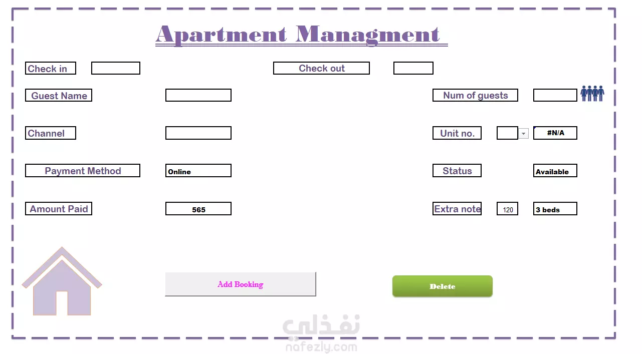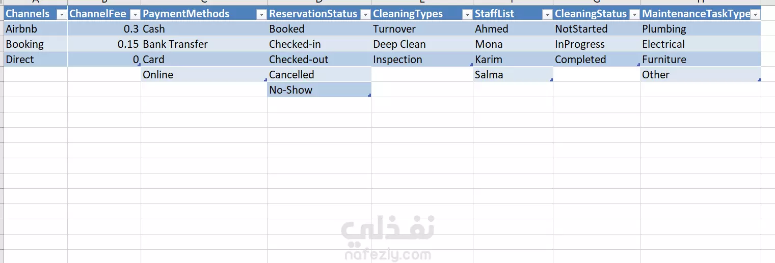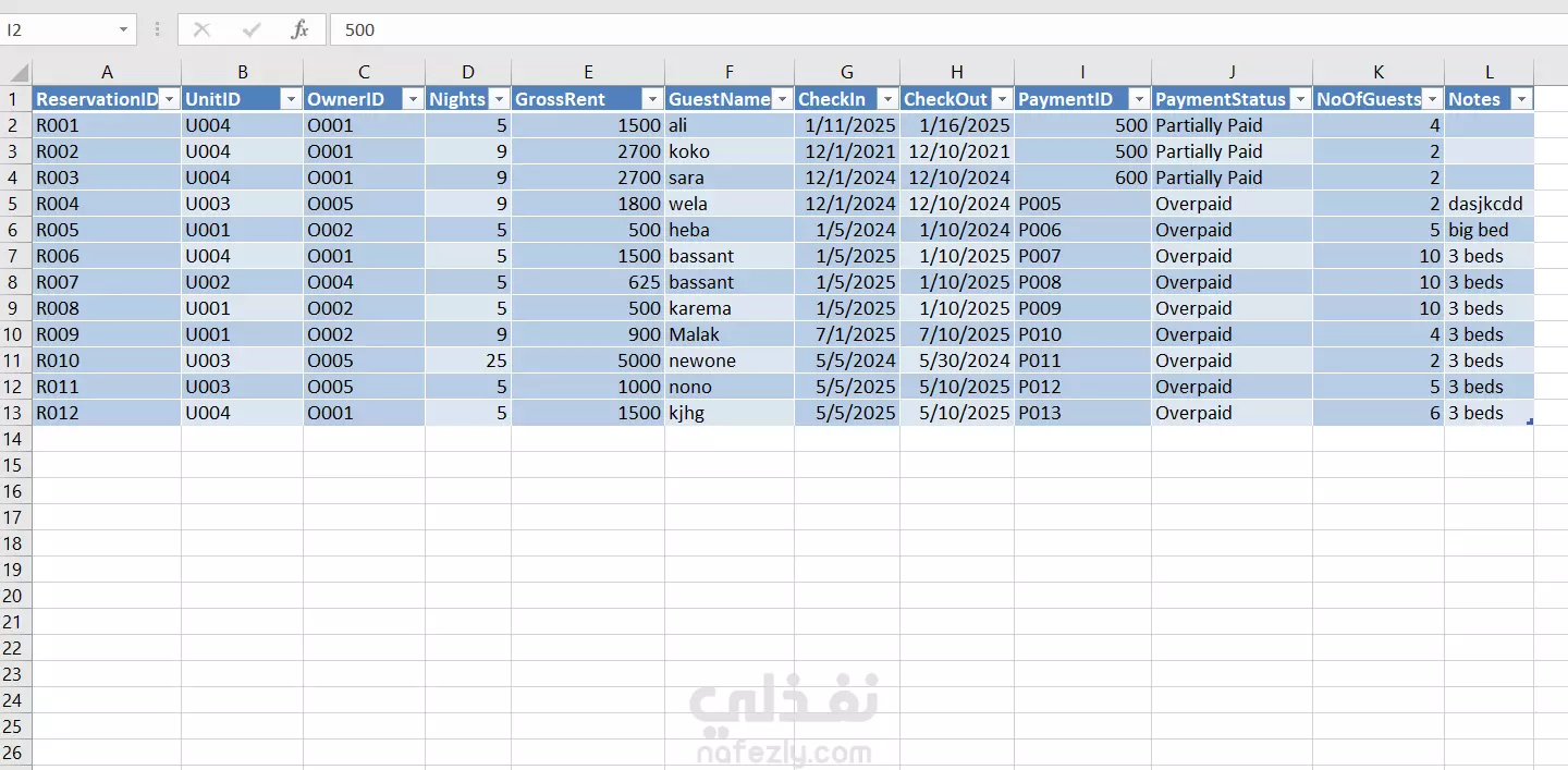 يمكنني تصميم ملفات Excel : -إدارة بيانات الحجوزات مع متابعة يومية أو شهرية. -متابعةالغرف والمدفوعات مع إشعارات أو تنسيقات ذكية. -جداول حجوزات وفواتير للمشاريع العقارية أو الإيجارات. -تحويل عمليات ورقية إلى نظام إلكتروني مرتب وسهل التحكم. -إضافة روابط تواصل مباشرة (مثل WhatsApp) وتوليد تقارير بضغط زر.