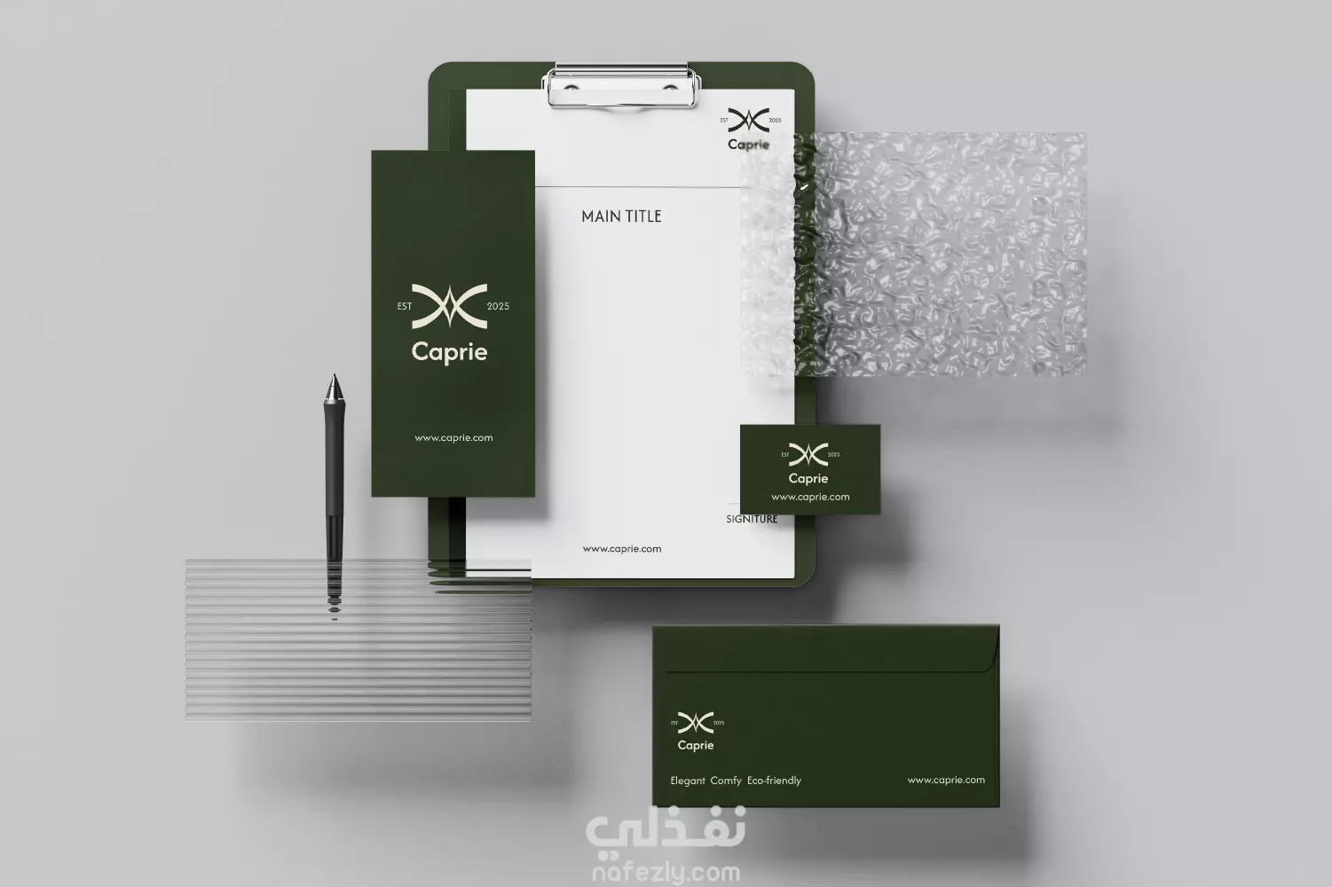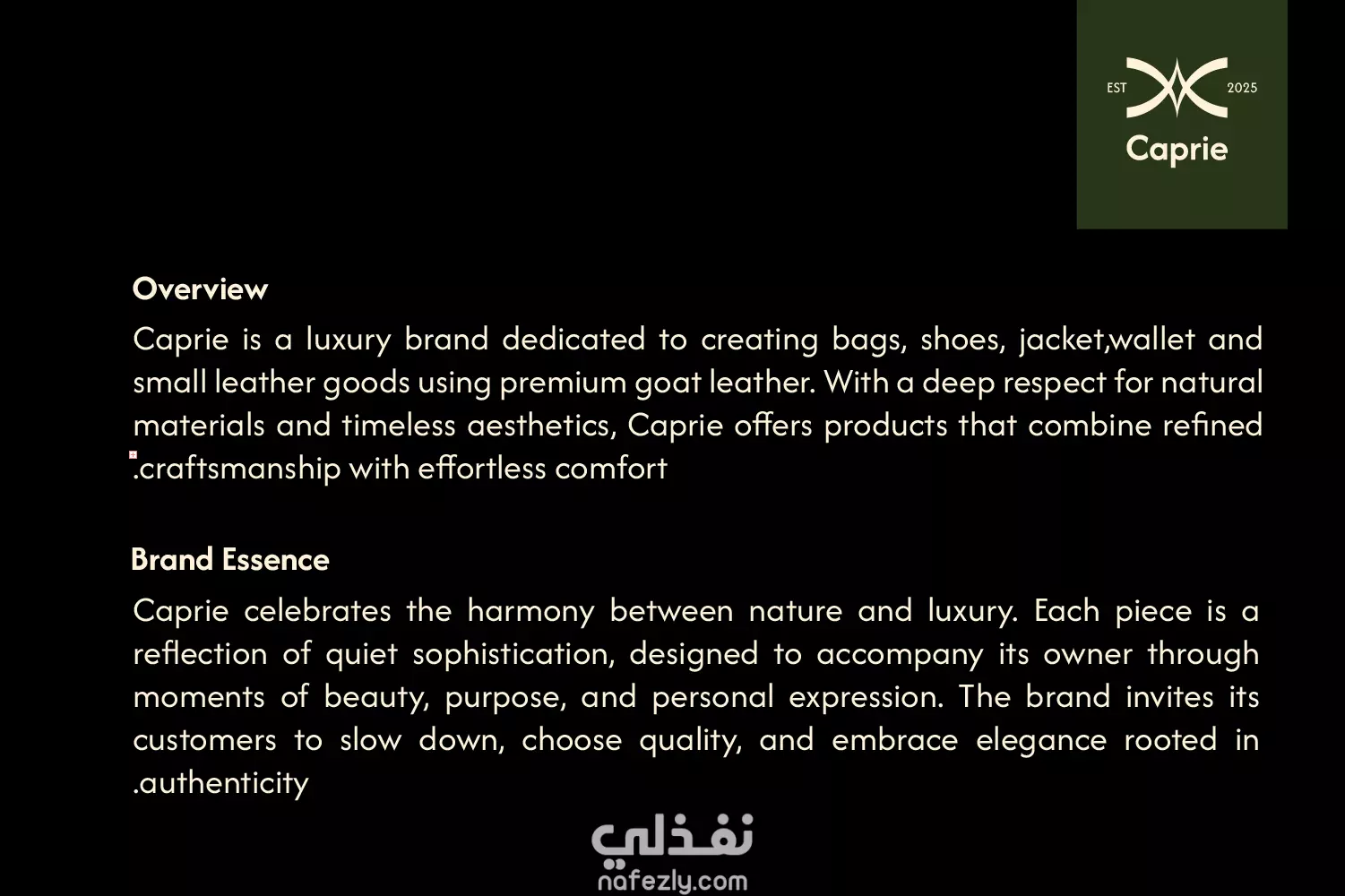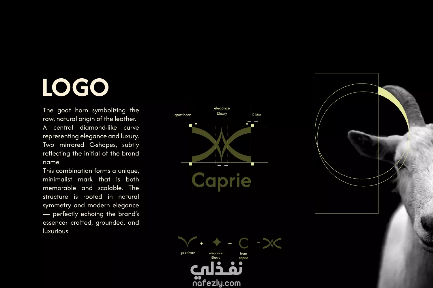 صممتُ هوية بصرية متكاملة لعلامة Caprie، وهي علامة تجارية فاخرة متخصصة في صنع بضائع من جلد الماعز مثل ) حقائب , احذية , جواكت , دفترملاحظات ...الخ(. شمل عملي على ايجاد فكرة مميزة للشعار وتصميمه، واختيار ألوان العلامة التجارية، واختيار الخطوط، بما يتماشى مع قيم العلامة التجارية المتمثلة في الأناقة والأصالة والاستدامة.