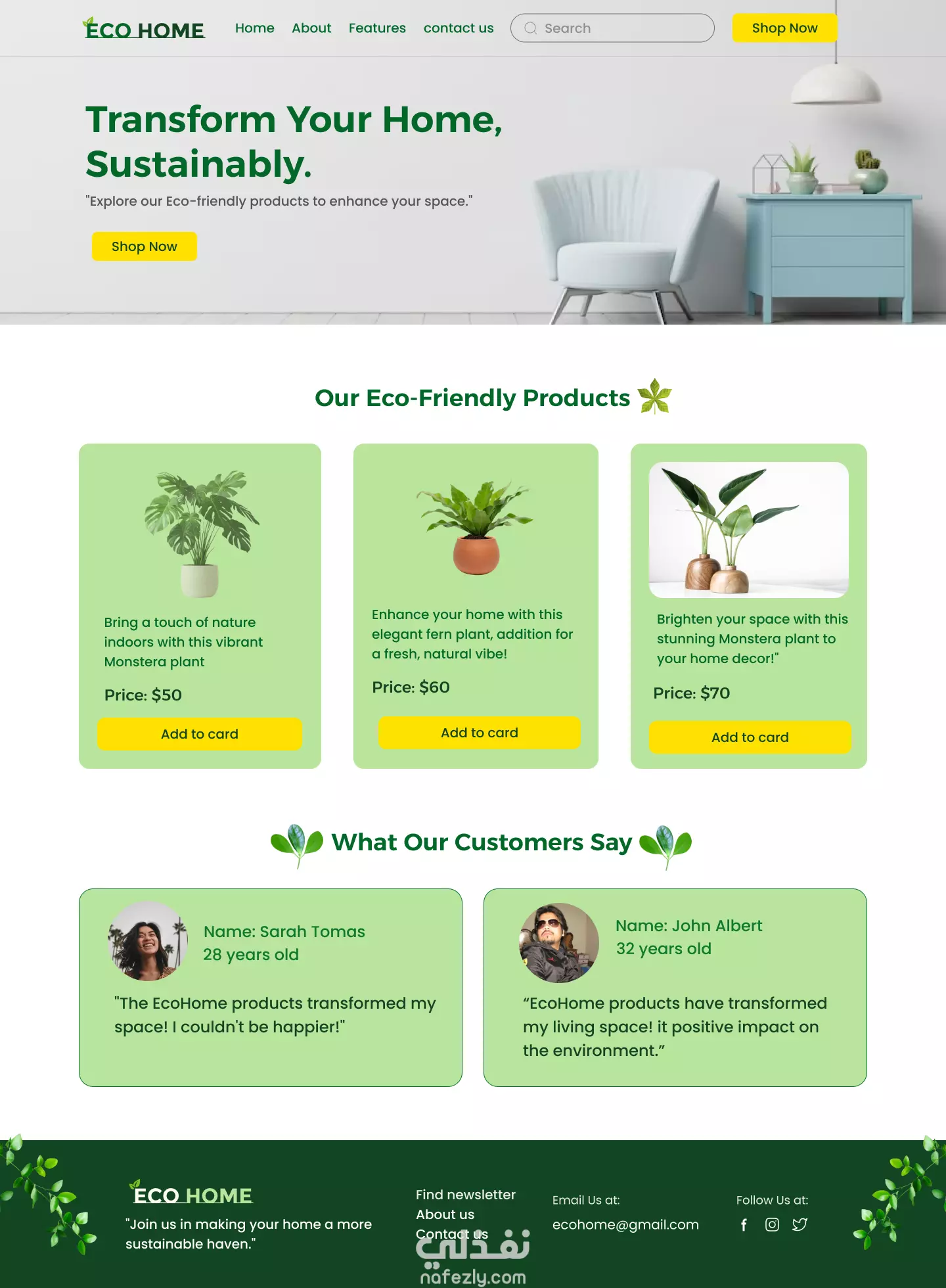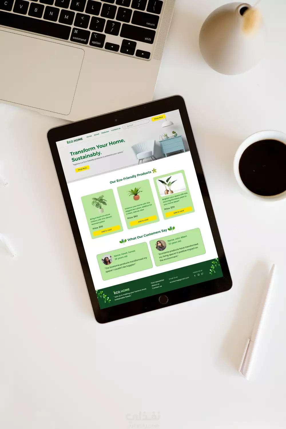 صفحة هبوط عصرية ومتجاوبة صُمِّمت للتعريف بخدمات ومنتجات Eco Home الخاصة بالحلول المنزلية الصديقة للبيئة.