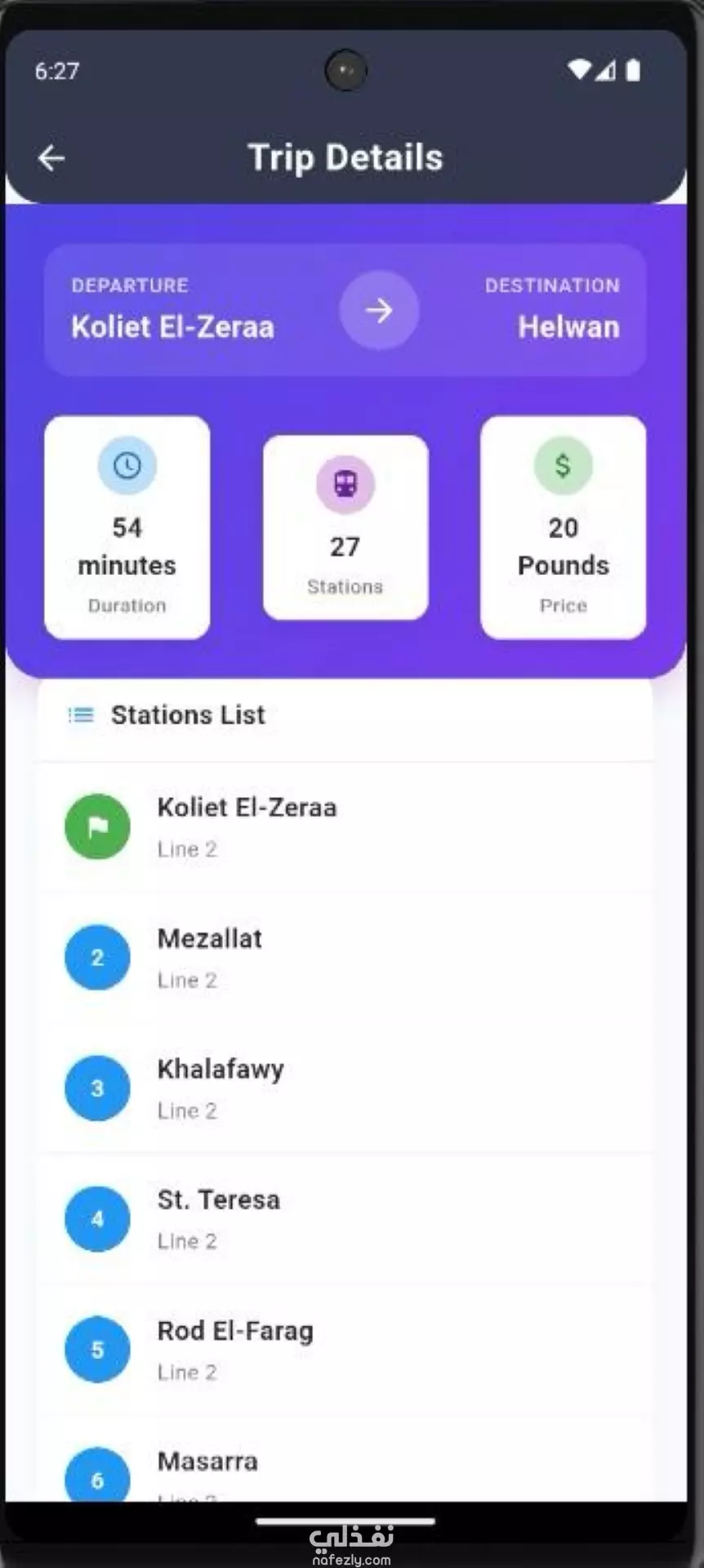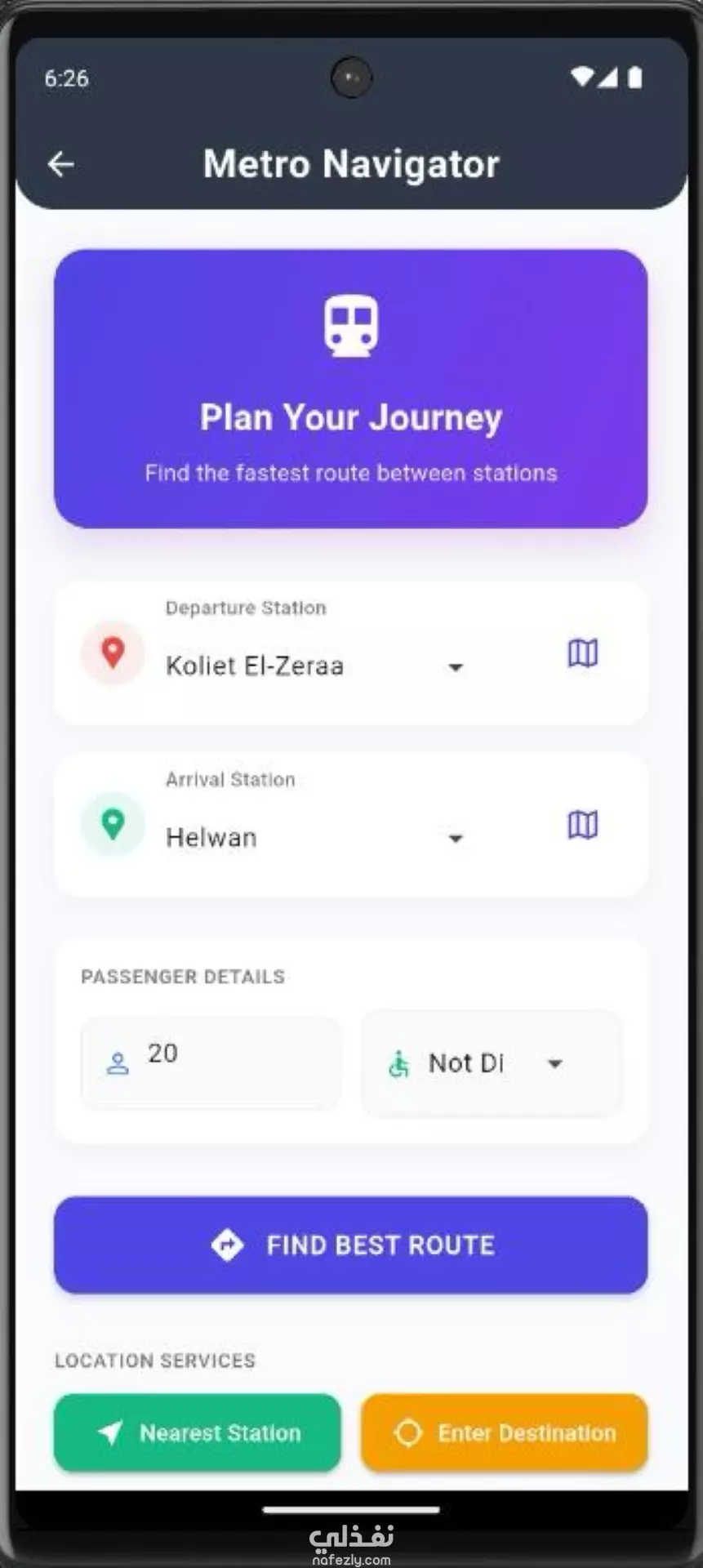 in STAR Technique 🎯 فكرة المشروع (Idea) تطبيق موبايل يساعد المستخدمين في التنقل داخل مترو القاهرة بسهولة. الهدف هو توفير وسيلة ذكية و بسيطة للمستخدمين (خصوصًا الزوار أو اللي أول مرة يركبوا المترو) عشان يعرفوا: أقرب محطة مترو لمكانهم الحالي. أسهل طريق للانتقال من محطة لأخرى. زمن الرحلة المتوقع. ⚡ التحديات (Challenges) تعقيد شبكة المترو (تغييرات بين الخطوط / محطات كتير). صعوبة وصول المستخدم العادي للمعلومات بشكل مرتب وسريع. ضرورة إن الواجهة (UI) تبقى واضحة جدًا ومفهومة لأي شخص. إضافة ميزة GPS لتحديد أقرب محطة للمستخدم تلقائيًا. 🛠️ الحل (Solution) Flutter & Dart: لبناء تطبيق Cross-Platform (Android & iOS). واجهة مستخدم بسيطة (UI/UX): تصميم أنيق بأيقونات واضحة ومسارات ملونة. GPS Integration: يحدد أقرب محطة تلقائيًا ويعرضها للمستخدم. Route Finder: خوارزمية بسيطة بتظهر أسرع مسار بين محطتين مع عرض محطات التبديل. Database: تخزين بيانات الخطوط والمحطات محليًا (SQLite) أو Online (Firebase). Search Feature: البحث باسم المحطة أو الخط. ✅ النتيجة (Results) التطبيق ساعد المستخدمين يتنقلوا بسهولة بدون لخبطة. قلل الوقت اللي بيحتاجه أي شخص عشان يعرف محطته أو يتنقل بين الخطوط. بقى دليل عملي وسهل للي أول مرة يركبوا المترو. ⚙️ التقنيات المستخدمة (Tech Stack) Flutter, Dart Firebase / SQLite Google Maps API (لو عايز تضيف عرض للخريطة) State Management (Provider / GetX)