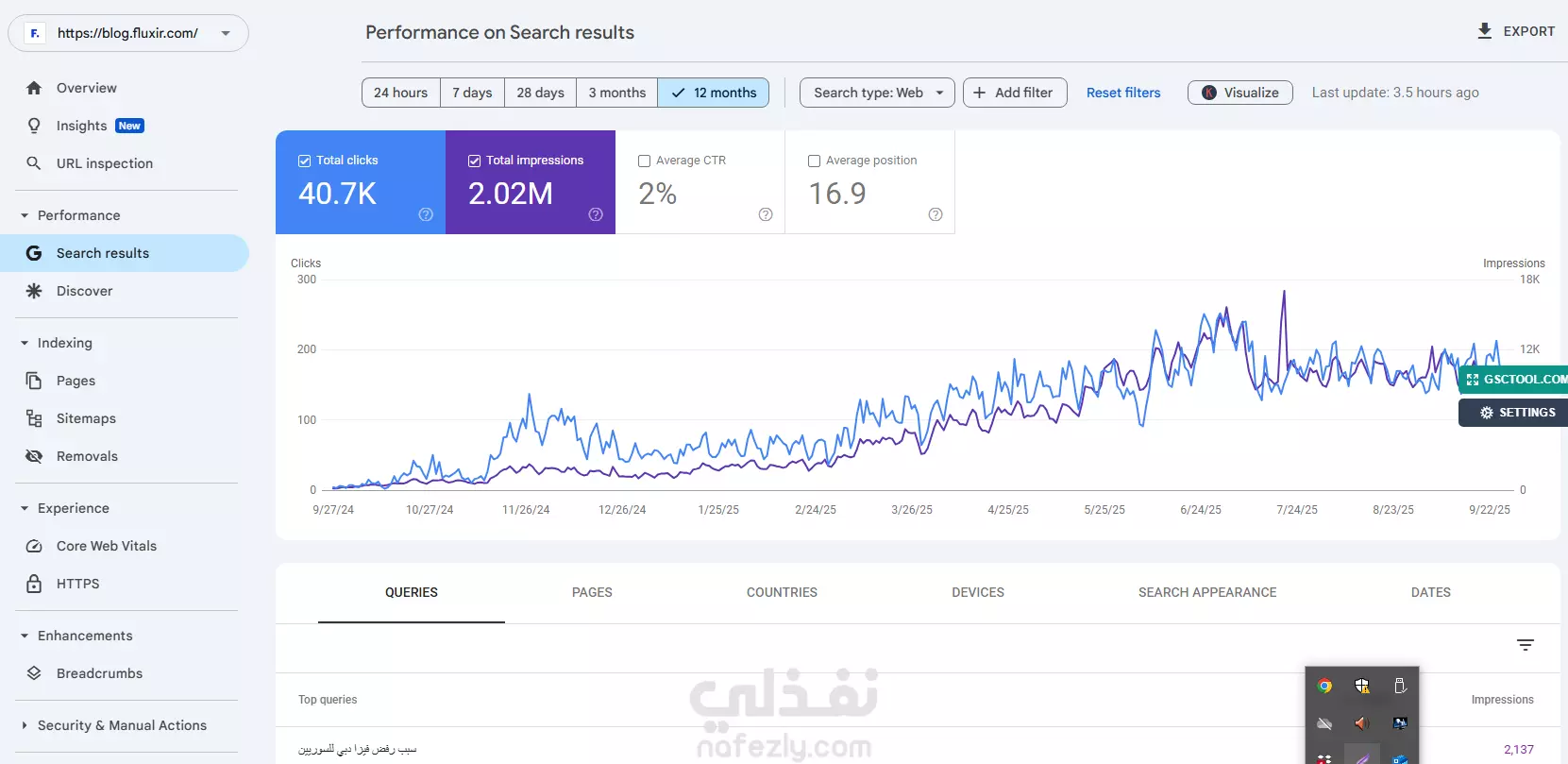 ملخص أعمالي كخبير SEO خلال عام من العمل مع Fluxir خلال عام من العمل ضمن فريق Fluxir، توليت مسؤولية تنفيذ استراتيجية شاملة لتحسين محركات البحث (SEO) بهدف رفع ترتيب الموقع في نتائج Google وزيادة الزيارات العضوية. أبرز المهام التي نفذتها: إجراء تحليلات فنية كاملة للموقع (Technical SEO Audits) ومعالجة مشاكل السرعة والزحف والفهرسة. تحسين المحتوى الداخلي وهيكل الصفحات باستخدام أفضل ممارسات On-Page SEO. تنفيذ حملات بناء روابط خلفية طبيعية من مواقع ذات موثوقية عالية (Link Building). تحسين نتائج البحث المحلية (Local SEO) من خلال Google Business Profile والاستشهادات المحلية. استخدام أدوات مثل Google Search Console، Ahrefs، SEMrush لتتبع الأداء وتحليل النتائج. النتائج المحققة: زيادة الزيارات العضوية لاكثر من 10 الاف زياره شهريا تحسين ترتيب كلمات مفتاحية هامة لتظهر في الصفحة الأولى من Google. نمو ملحوظ في عدد العملاء المحتملين (Leads) من نتائج البحث المجانية. هذا الإنجاز يعكس قدرتي على تنفيذ حلول SEO فعّالة وقابلة للقياس، مبنية على تحليل دقيق وخطط استراتيجية مخصصة.