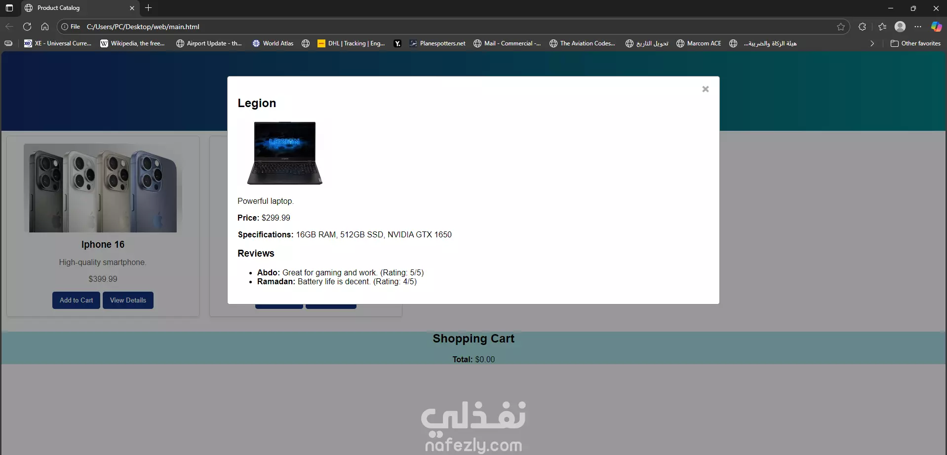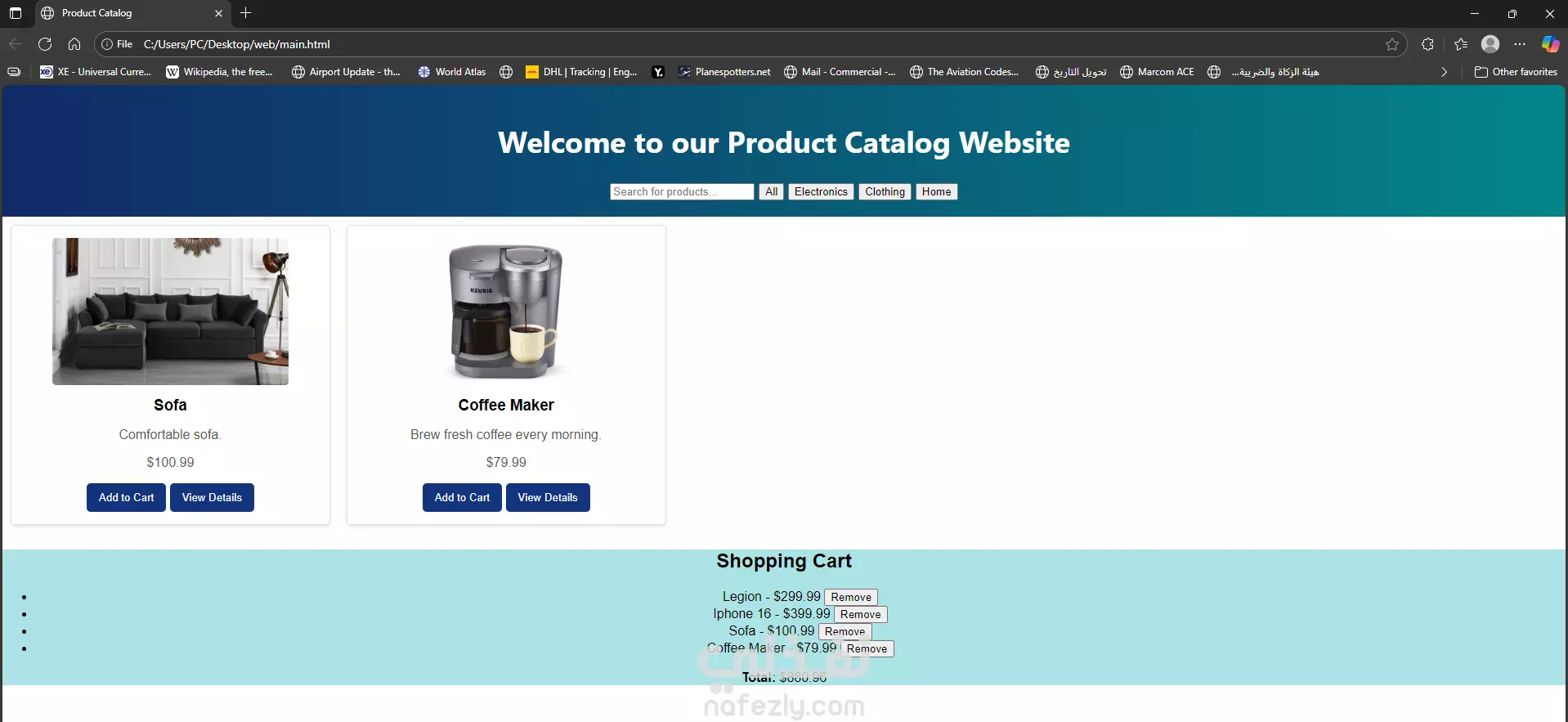 Product Catalog and Shopping Cart system built using HTML, CSS, and JavaScript. It allows users to browse products, search, filter by category (Electronics, Clothing, Home), and view detailed information about each item including description, price, specifications, and customer reviews.
