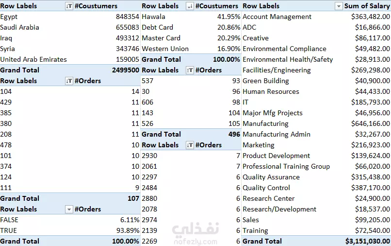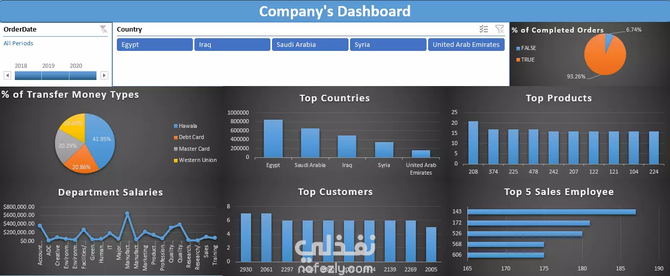 يُعد هذا المشروع نموذجًا عمليًا لتحويل بيانات الشركة إلى رؤى قابلة للتنفيذ من خلال لوحة تحكم تفاعلية باستخدام Excel. تعتمد الـ Company’s Dashboard على أدوات قوية مثل PivotTables، Slicers، Conditional Formatting، Power Query، Data Validation، Named Ranges، Dynamic Charts، وTimeline، بالإضافة إلى دوال مثل IF statements، SUMIFS، وMATCH لربط البيانات وتصفية النتائج بدقة. تعرض اللوحة مجموعة متنوعة من المؤشرات، منها: إجمالي الإيرادات، عدد الطلبات المنفذة وغير المنفذة، توزيع طرق الدفع، تحليل الرواتب حسب الأقسام، ترتيب الدول حسب حجم العمليات، تقييم أداء موظفي المبيعات، المنتجات الأعلى طلبًا، العملاء الأكثر نشاطًا، الاتجاهات الزمنية في الطلبات، ونسب النمو والتراجع في الأداء. تم تصميم الواجهة بشكل احترافي لتسهيل التنقل والتفاعل، مما يساعد فرق العمل والإدارة على اتخاذ قرارات ذكية وسريعة مبنية على بيانات دقيقة ومحدثة.